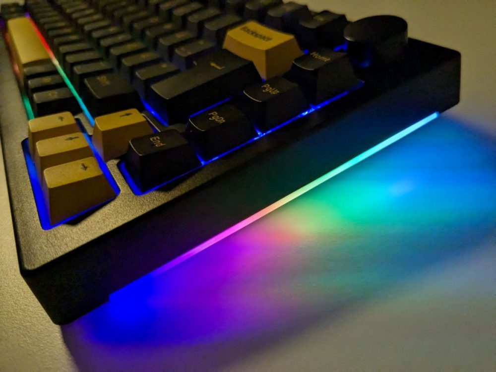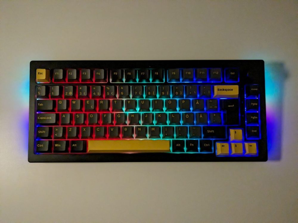 Utöver själva tangentbordet och en generisk USB-C-kabel följer det med två verktyg för att byta tangenter och switchar, fem stycken extra switchar samt ett urval tangenter i en gul accentfärg. För prisklassen är detta ett ganska generöst tillägg. Medföljande verktyg och extra switchar kom också väl till pass. Under våra tester visade det sig nämligen snabbt att en switch var död. Utan att lämna spelsessionen kunde vi ta bort tangenten och den trasiga switchen samt montera ihop allt med reservswitchen på under 20 sekunder. Ytterligare en switch visade sig vara defekt då den dubbelregistrerade inputs. Tråkigt att två var trasiga från början, men mycket smidigare att snabbt själv kunna byta ut dem direkt istället för att kontakta återförsäljaren för att initiera ett garantiärende.