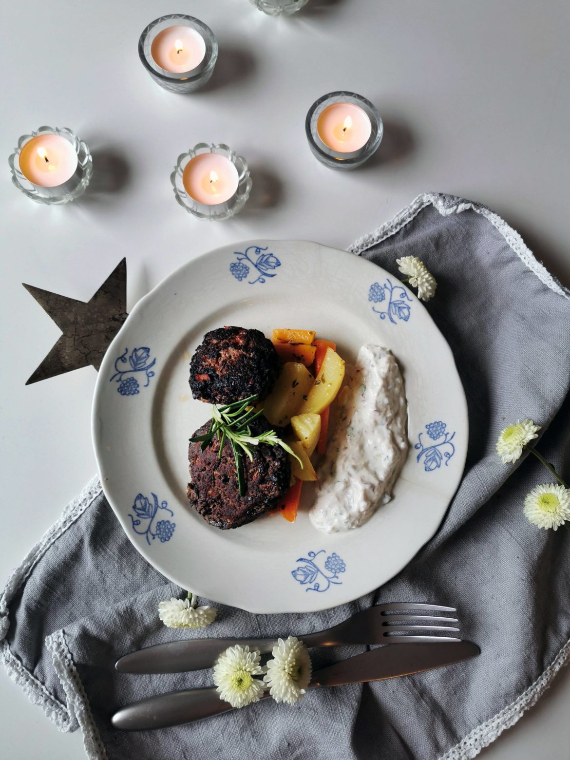 Då tänker jag att man börjar med rotfrukterna, för de tar längst tid på sig i ugnen. Blanda sedan såsen och låt stå till sig i kylen. Avsluta med att göra biffarna.