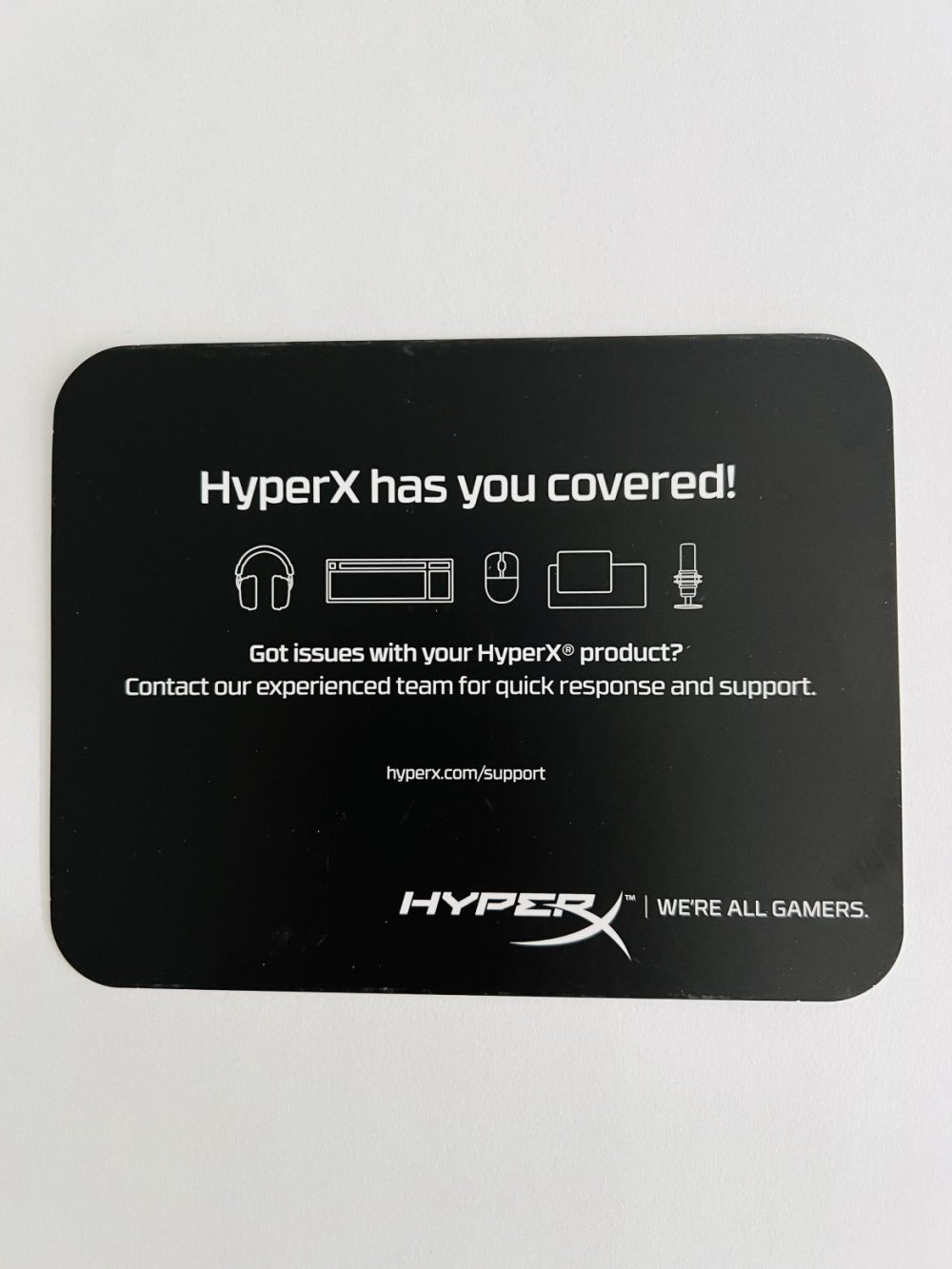 Finns det något bättre än att få unboxa en sprillans ny teknikpryl? För oss på redaktionen är det lite av ett halleluja-moment att försiktigt bända upp lådor och dra av plasten.. Och det första jag reagerade på när jag öppnade kartongen är en medföljande lapp med budskapet: “HyperX has you covered! Got issues with your HyperX product? Contact our experienced team for quick response and support.” Detta ger en personlig touch och ger känslan att företaget finns där om det skulle vara något.
