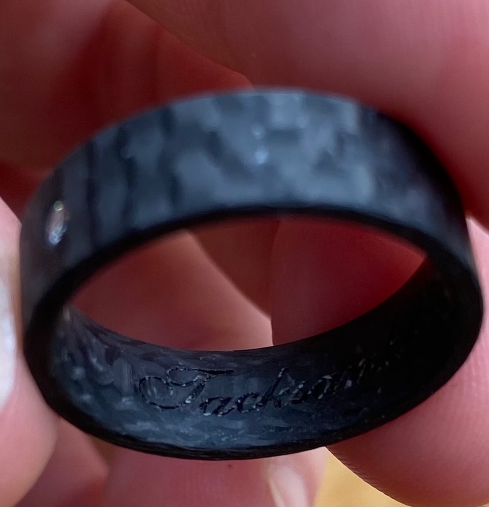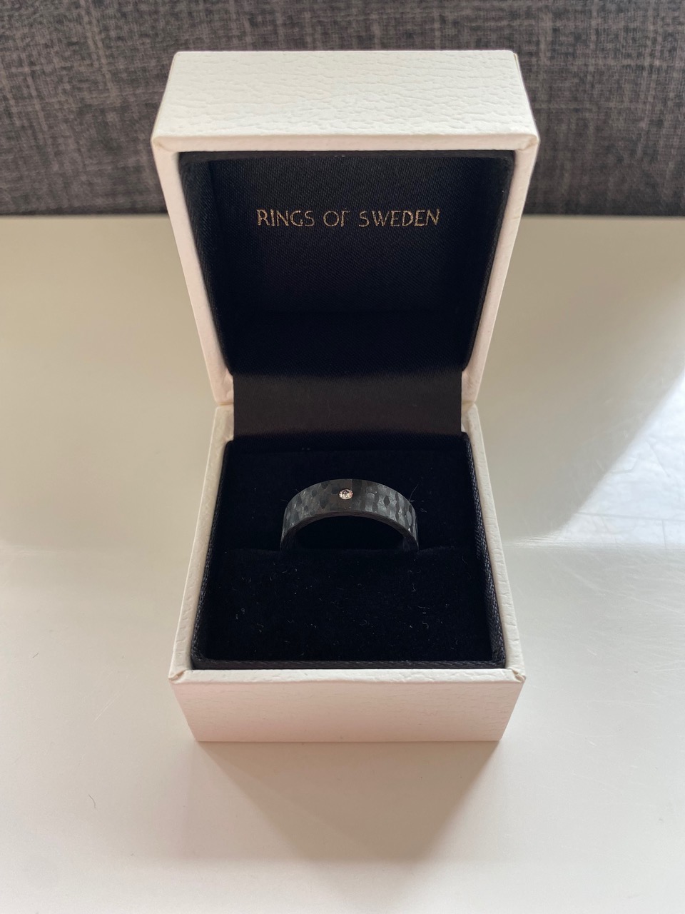 Jag, som annars inte brukar bära ringar, kände plötsligt lust för att prova en kolfiberring, något jag nu fått tillfälle att göra i samarbete med Rings of Sweden. När jag läser på om ringarna får jag reda på att det finns två former av rent kol, en djup svart och en ren, vit. Jag väljer en enklare modell i svart med en vacker diamant i mitten.