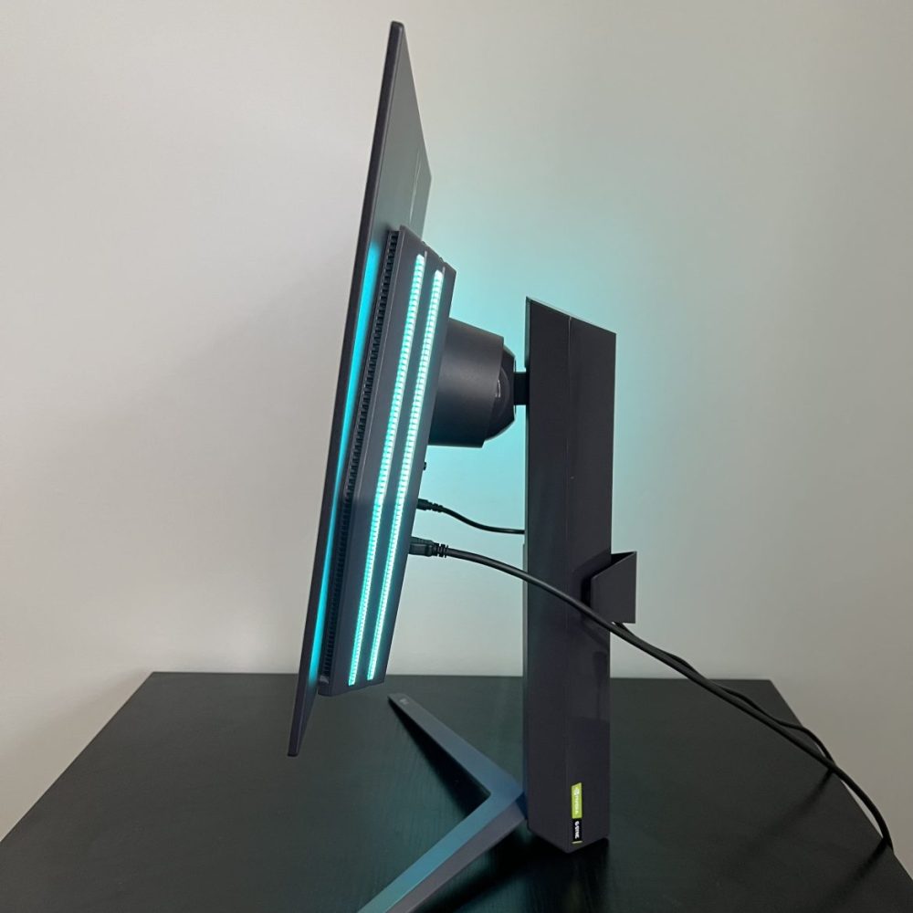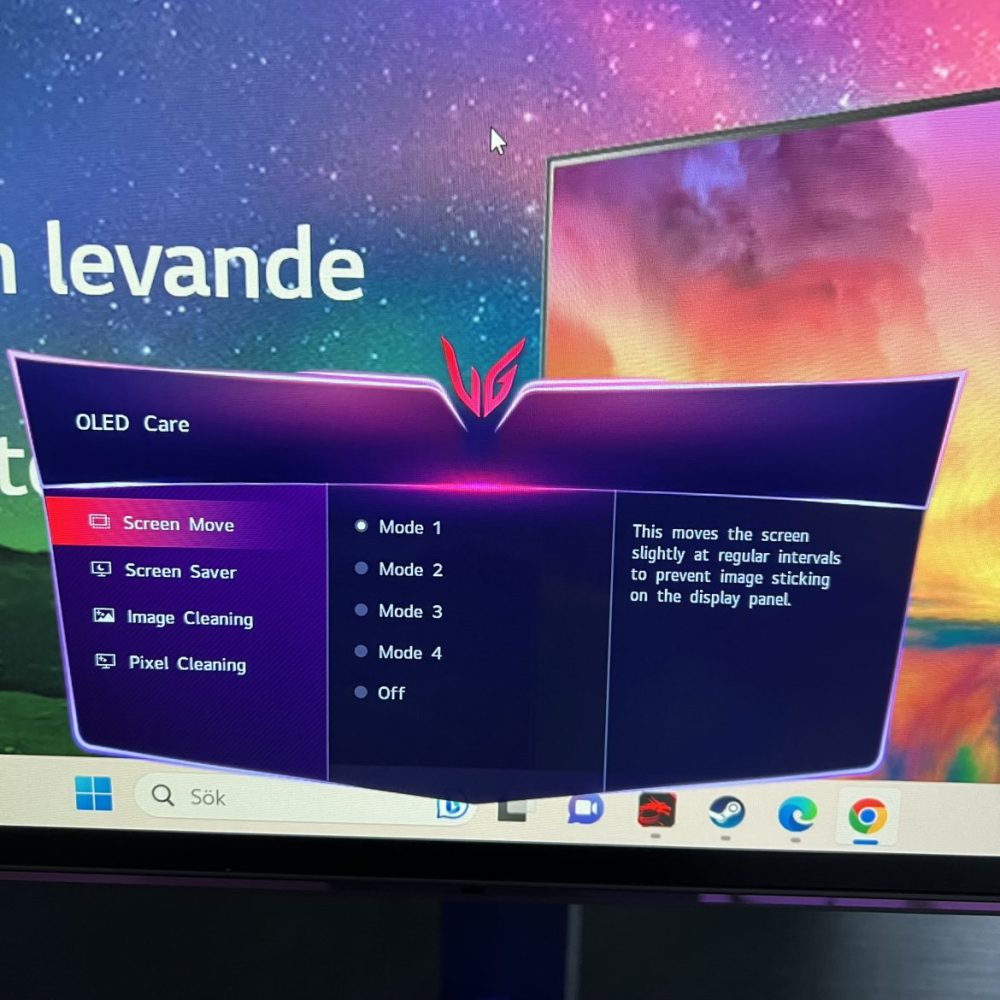 Skärmen har även RGB på baksidan som skapar därigenom en härlig gaming-atmosfär. Det finns olika inställningar som man kan testa sig fram med kontrollen så att man hittar den färgen eller det skiftande ljuset som passar just dig. Med denna kontroll kan man även välja olika inställningar för ljus och skärpa. Det finns förvalda inställningar som man enkelt kan välja i menyn för att skapa en bättre upplevelse för just det spelet du spelar. Det finns även en funktion i menyn där man kan aktivera bildrengöring och pixelrengöring som man kan hitta i menyn. Det finns dessutom möjlighet här i menyn att ställa in en skärmflyttning så att skärmen flyttar på sig med mellanrum, detta för att förhindra inbränningar. Jag önskar dock att det hade funnits en mycket tydligare manual med i förpackningen om vad som är värt att tänka på när det kommer till denna skärm i allmänhet. Eftersom att denna skärm kostar en slant skulle det vara synd om man inte gav denna den kärleken och omsorgen som den förtjänar.