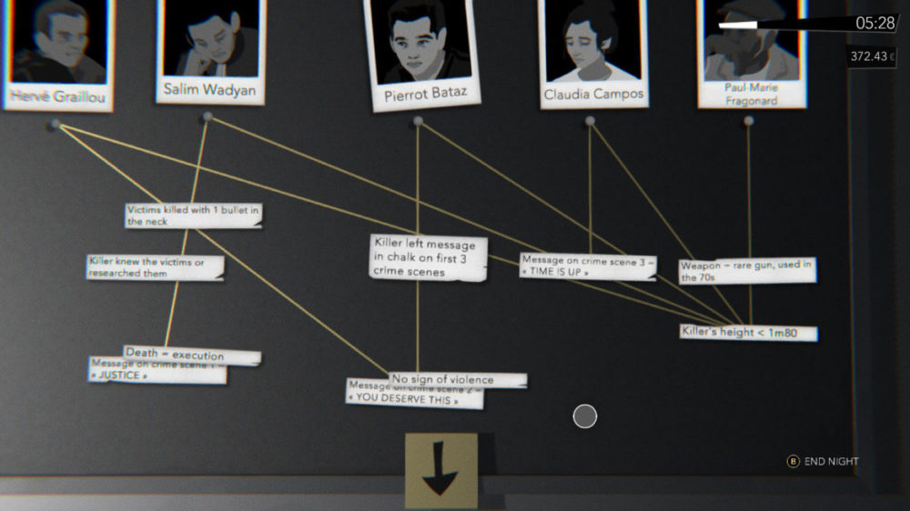 De personer du plockar upp ger dig ledtrådar till din mordutredning och när du väl är hemma igen så för du upp informationen på en tavla i ditt hus. När du har tillräckligt med information får du en fråga om du kan peka ut mördaren. Lyckas du så vinner du och kan fortsätta, misslyckas du så är spelet slut. Tyvärr så är det inte helt lätt att hålla allting i huvudet och försöka få någon rätsida på all information. Så det var till slut mer tur än skicklighet att hitta mördaren, tyckte jag.