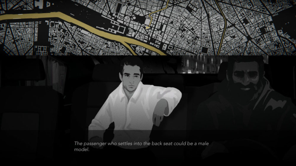 Night Call är textbaserat och har en ganska simpel grafik. Du får se en karta över Paris, där du ser de olika kunderna. Klicka på en kund och pilen åker dit. Du plockar upp din kund och därefter följer en konversation med denna. Nu blir Night Call mer intressant, för till en början så tyckte jag att spelet var väldigt simpelt och kändes ytterst lågbudget – men när de olika kunderna börjar prata så händer det något. Tyvärr så är allt text-baserat, så du finner dig tryckande på A-knappen konstant för att komma till nästa mening. Det finns ett autoläge men det kändes hela tiden antingen för långsamt eller för snabbt.