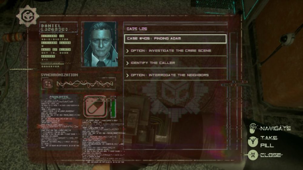 Observer släpptes till de andra spelplattformarna redan i augusti 2017 och finns just nu som del av Xbox Game Pass spelutbud. Nu kommer det till alltså (som så många andra spel) till den framgångsrika Switchen. Och precis som i så många andra Switch-konverteringar, så har man inte riktigt räknat med hur smått allting blir i hybridkonsolens bärbara läge. Vissa detaljer blir pyttesmå i displayen. Däremot så har man varit smarta och använda sig av Switchens touch-display: så du kan peka och klicka direkt på skärmen för att undersöka något. Dock så fick jag det inte att funka när man ska dra ut lådor och öppna dörrar.
