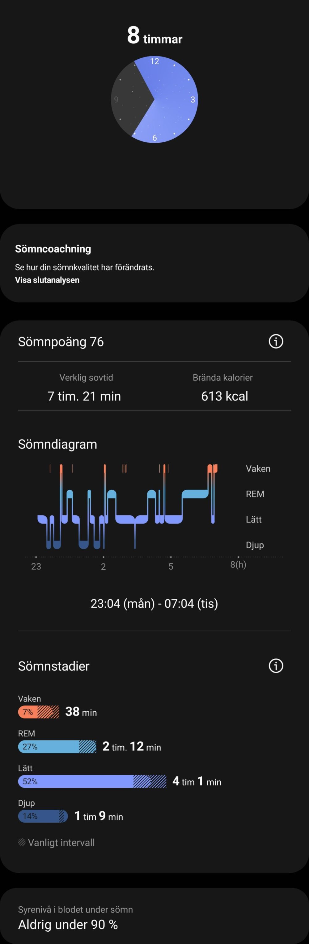 Har man på sig klockan när man sover så mäter den hur väl man sover, sömnstadier, puls och syrenivå. Vi har jämfört resultatet genom att sova med en klocka från Fitbit eller Huawei på andra armen, och resultatet är någorlunda överensstämmande. Trots att klockan är rätt stor är det inga problem att sova med den. Den är så lätt (33 gram) och det medföljande armbandet så mjukt så man vänjer sig snabbt.