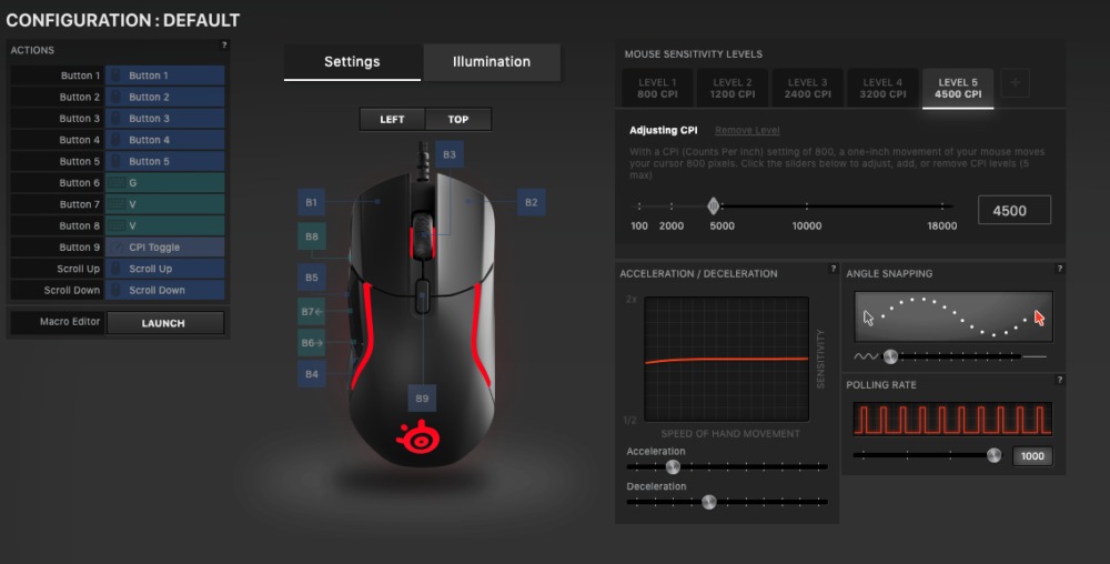 Rival 5 är trådad och har en snygg, flätad sladd som inte hakar i eller trasslar sig. När jag kopplar in den i datorn så laddar min Steelseries-app direkt ned drivrutinerna och den lyser upp i listan över tillgängliga produkter. Här ligger verkligen en av Steelseries största styrkor: deras mjukvara. Inga som helst problem och det funkar lika bra till Mac som till PC. Du har nu direkt koll på din gaming-mus och här kan du göra alla inställningar du någonsin har velat. Varför inte programmera alla nio knappar till att passa just dig, tweaka den coola RGB ljusshowen och så har du möjligheten att ställa in fem nivåer av CPI (Counts per Inch – det vill säga hastigheten och precisionen). Du kan nu lätt klicka mellan dessa fem lägen genom en enkel knapptryckning. Perfekt, då du kan ha olika inställningar beroende på vilka spel du spelar eller program du använder.