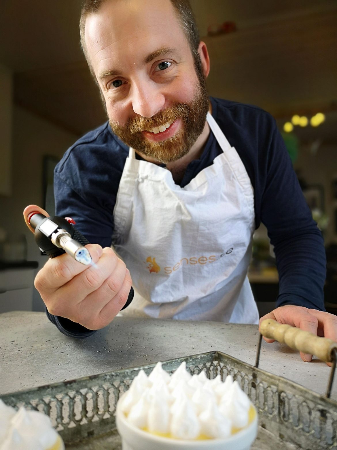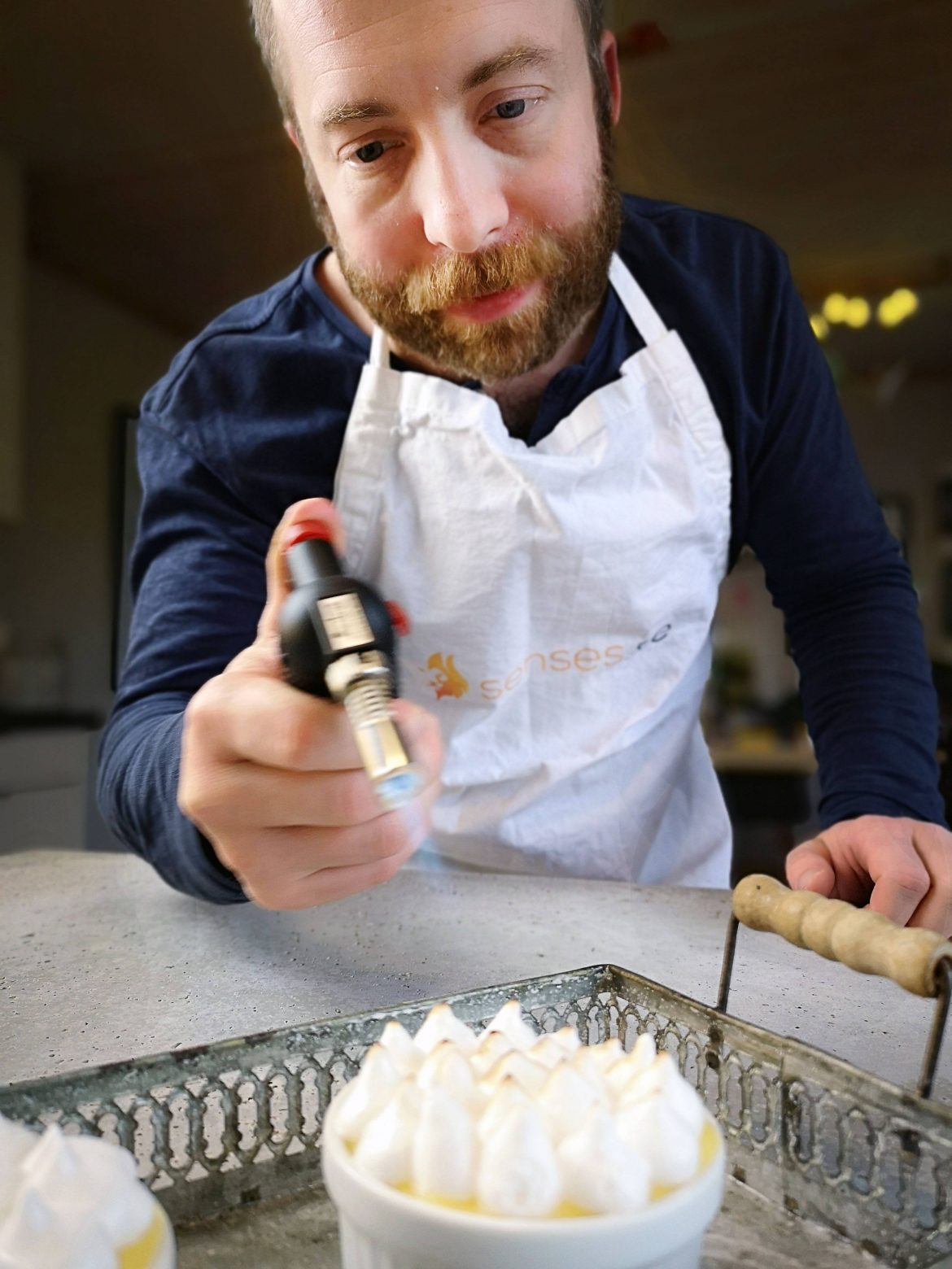 Ta fram den svala pajen och en spritspåse. Använd en smal tyll eller gör bara ett litet hål i spritspåsen. Fyll med den italienska marängen och spritsa fina toppar på pajen. bränn sedan av marängen med brännare. Tänk på att det går riktigt snabbt att få färg på marängen, vi pratar sekunder.