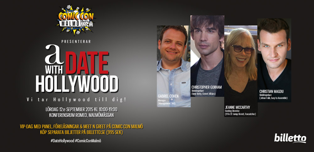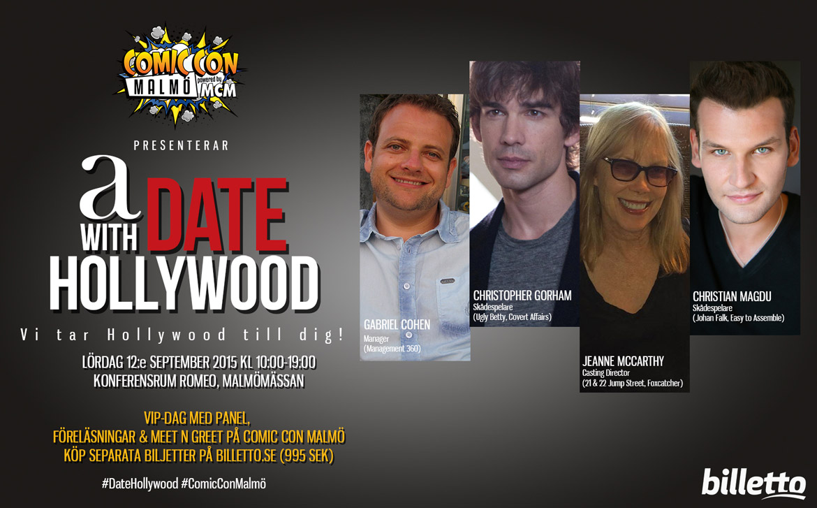 Inför mässan Comic Con Malmö i september, som äger rum för första gången på splitternya Malmömässan, så presenterar Comic Con vårens stora succé A Date with Hollywood igen, med nya, rykande heta gäster ifrån drömfabriken i Hollywood under en särskild VIP-dag. Biljetterna till VIP-dagen kommer att vara begränsade till 100 stycken och även gälla som entrébiljett till själva Comic Con-mässan nästa dag. Du köper din biljett via Billettos hemsida och följer uppdateringar kring eventet på sociala medier under #DateHollywood och #ComicConMalmö.