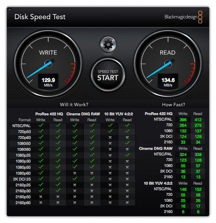 ADATA-diskarna kommer formaterade som FAT32, vilket gör att de funkar direkt med både PC och Mac, men den kloke användaren gör såklart bäst i att formatera om dem till det format som är optimerat för operativsystemet de använder, för att slippa begränsningarna med det gamla MS-DOS-formatet. Eftersom vi på senses.se kör Mac (High Sierra) så formaterade vi om diskarna till Mac OS X Extended (journalförd) (krypteringsprogramvaran som ingår stöder bara PC). Till våra förvåning gjorde detta dock inte någon jättestor skillnad på resultatet. Vi har använt BlackMagic Disk Speed Test, ett gratis benchmark-program som alla kan ladda ned och som testar prestanda i ett simulerat fall av video-redigering, något man realistiskt kan använda en extern hdd till och vilka faktiska resultat man då kan förvänta sig. BlackMagic anger med hjälp av bockar vad programmet uppskattar att disken är lämplig för, ju högre upplösning och fler frames, desto tyngre last (4K vid 60 fps är mördande i 10-bitars färgdjup).