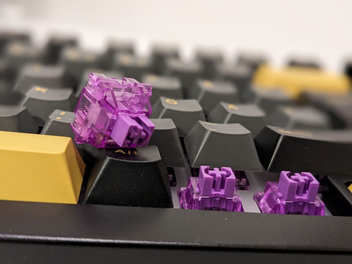 Utöver själva tangentbordet och en generisk USB-C-kabel följer det med två verktyg för att byta tangenter och switchar, fem stycken extra switchar samt ett urval tangenter i en gul accentfärg. För prisklassen är detta ett ganska generöst tillägg. Medföljande verktyg och extra switchar kom också väl till pass. Under våra tester visade det sig nämligen snabbt att en switch var död. Utan att lämna spelsessionen kunde vi ta bort tangenten och den trasiga switchen samt montera ihop allt med reservswitchen på under 20 sekunder. Ytterligare en switch visade sig vara defekt då den dubbelregistrerade inputs. Tråkigt att två var trasiga från början, men mycket smidigare att snabbt själv kunna byta ut dem direkt istället för att kontakta återförsäljaren för att initiera ett garantiärende.
