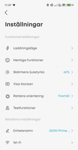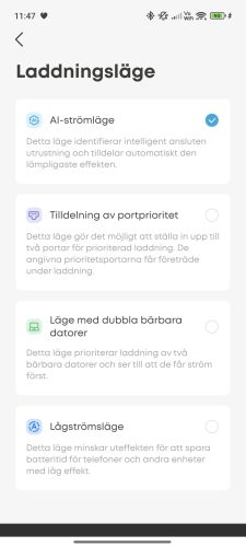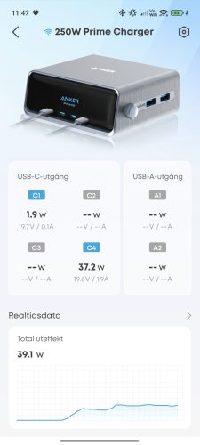 Till laddaren finns en tillhörande app där man kan göra alla inställningar, sätta upp wifi (ja, laddaren har wifi) och så vidare. Appen är riktigt omfattande och det finns massor med saker att ställa in, från hur den ska visa klockan till mer avancerade saker som att ställa in hur den ska prioritera olika laddningsportar. Man kan även se diagram på uteffekt över tid, antingen totalt eller separat på de olika portarna.