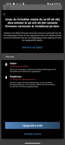 Något som kan vara bra att påpeka är att när man installerar den nya Essential-serien till ett befintligt Arlo-system så blir man uppgraderad till det senaste Arlo-gränsnittet i appen, vilket inte alla äldre Arlo-enheter är kompatibla med, så har du ett system med Arlo Go, Arlo Security Light eller Arlo Bridge, så riskerar du att de slutar att fungera med nya gränssnittet som kallas Arlo Secure 4.0. Det som är lite problematiskt är att installationen även varnar för att andra enheter inte ”stöds för närvarande” (som här med en Door Chime 2).