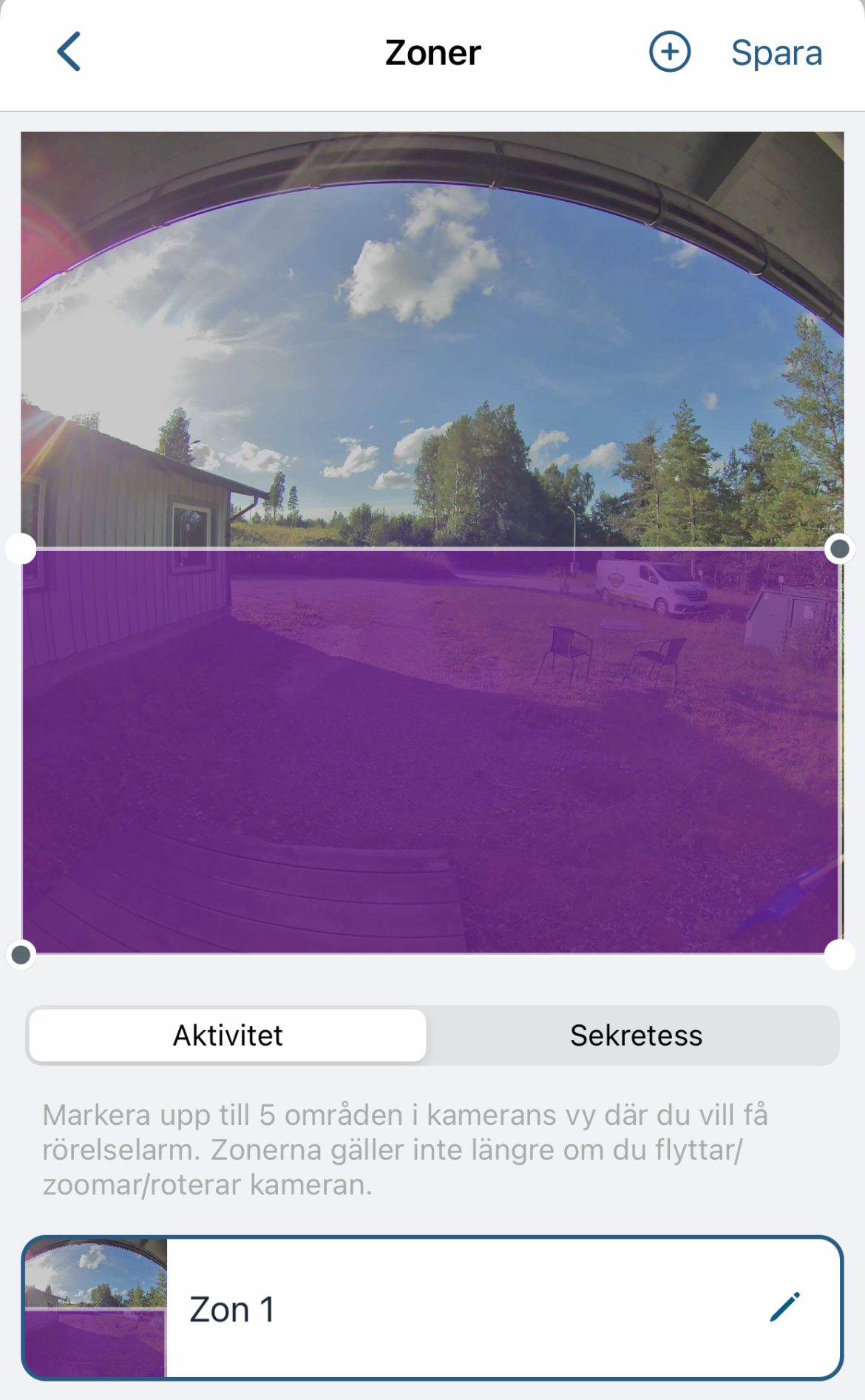 Nu kan jag gå in och justera inställningarna, och det mesta känns igen från förra versionen. Du kan ställa in känslighet och zoner och därmed verkligen skräddarsy din kamera efter dina förutsättningar. Jag har en väg ganska nära min tomtgräns, och den ger jag ingen zon så jag slipper få konstanta indikationer om att bilar åker ute på vägen. Men så fort som de åker in på min tomt så säger kameran till.