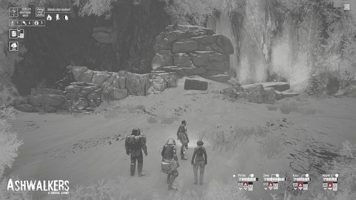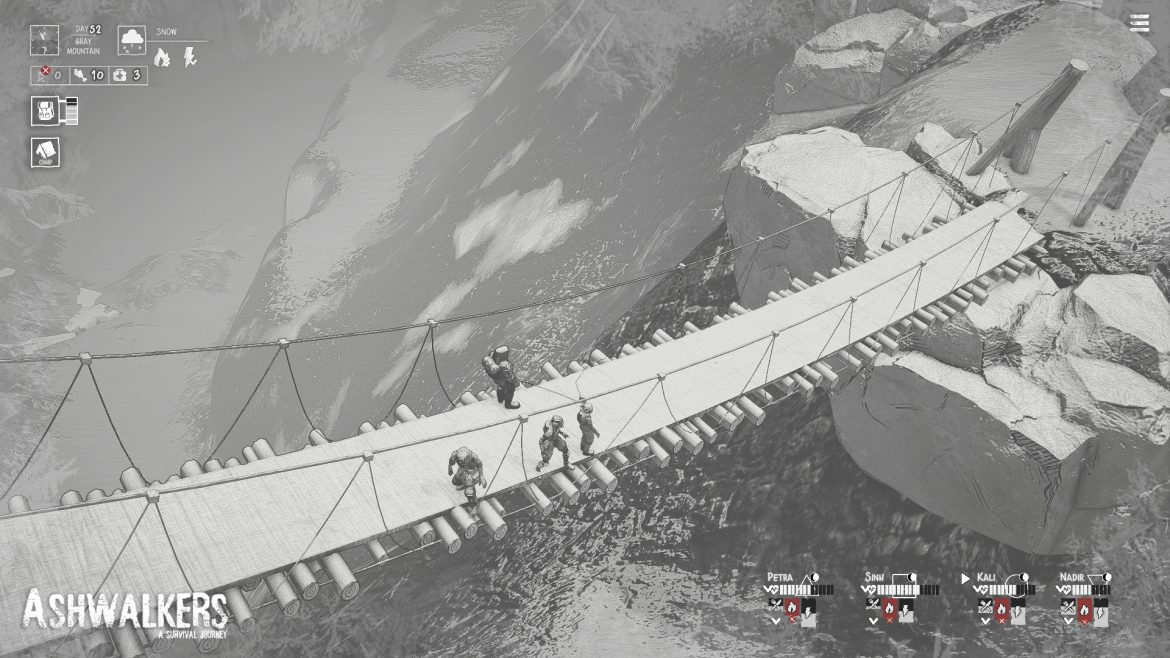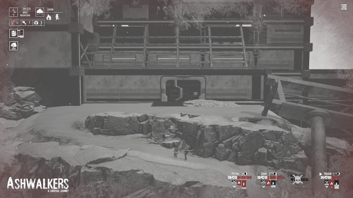 Ashwalkers är ett väldigt annorlunda spel och många gånger kan det vara något positivt, men så är inte fallet denna gång. Det använder sig av den postapokalyptiska temat för att förklara varför spelet helt och hållet är konstruerat i svartvitt. Animationerna är helt okej och den enda speltekniska du gör är att promenera genom den karga och färglösa miljön. När du möter någon eller något i Ashwalkers så finns det inga strider, inga animationer och inga interaktioner utan allt är text-baserat, som ett gammaldags rollspel. Det förkunnas helt enkelt efter ett möte om vilka skador de olika karaktärerna i din grupp har fått och om någon av dem strök med. Du kan inte påverka det för fem öre.
