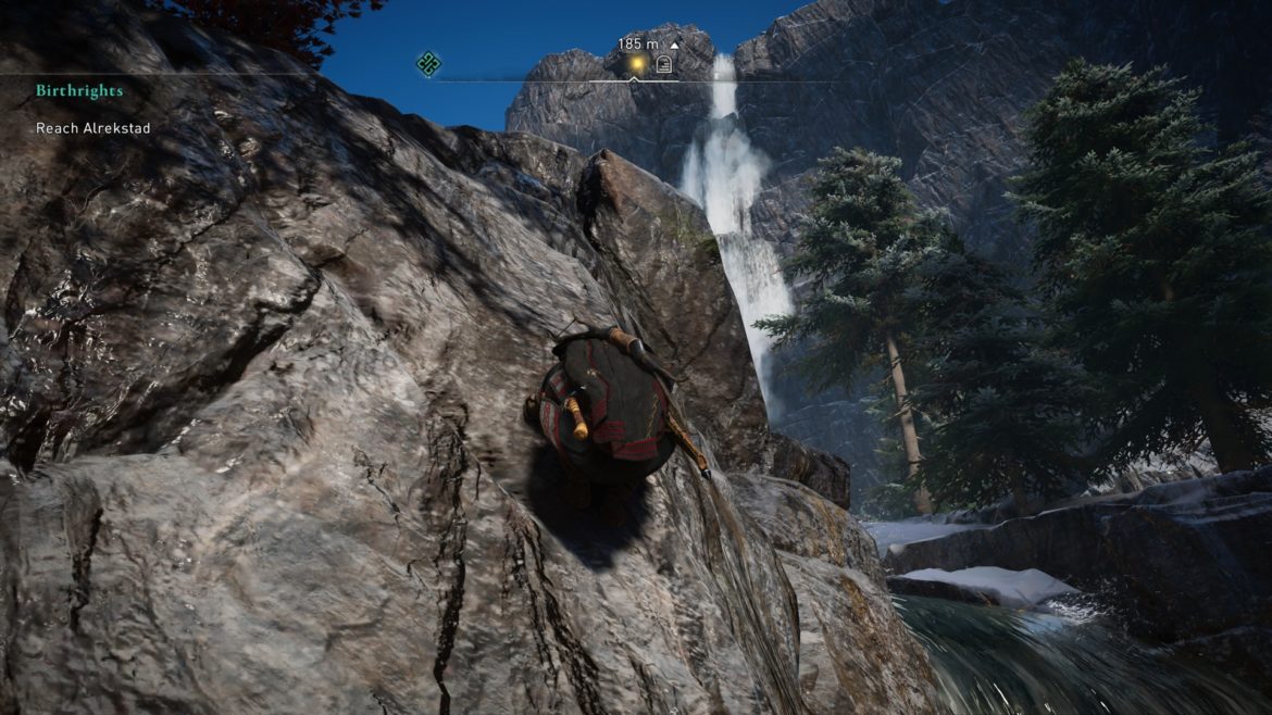 Jag börjar min resa med att följa protagonisten Eivor in i 800-talets, fornnordiska Norge. Det absolut första jag slås av är hur otroligt vackra scenerierna faktiskt är, från dalarna till bergen, vädret, himlen, havet och allt där emellan är otroligt välgjort. Bara de små detaljerna som att jag lämnar spår i den djupa snön när jag går i den till att vattnet ändrar riktning när en fisk kommer upp för att till ytan gör en gigantisk skillnad och fyller mig med en härlig känsla. Jag spenderade 60 minuter bara med att fri-klättra upp för ett vattenfall, bara för att jag tyckte att det var så otroligt vackert…