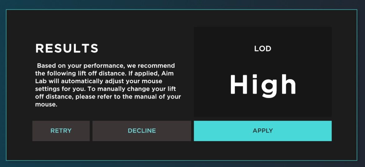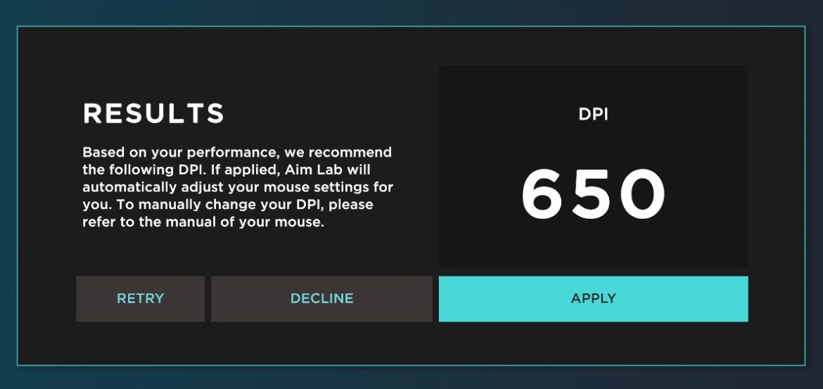 Sedan kör vi igång några av Aimlabs inbyggda tester som är till för att lista ut vilka inställningar som passar bäst till just din spelstil. Ganska roliga tester som ger resultat som mer eller mindre stämmer överens med våra egna uppfattningar sedan tidigare. Alltid skönt att få ”bekräftat” att man kör på rätt inställningar. Dessa tester kanske är mer användbara för nybörjare som inte har en aning om hur de ska ställa in allt. Att man sedan efter avslutat test kan trycka på en knapp så ändras musens inställningar efter Aimlabs rekommendationer är dock en mycket välkommen funktion.