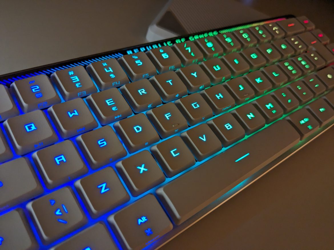 Förväntningarna var inte skyhöga, då redaktionens gamers inte haft så goda erfarenheter av lågprofilstangentbord innan. Oj, vad vår skepsis fick se sig motbevisad! Här är det svårt att inte använda förstärkande svordomar när vi ska beskriva hur det är att använda Falchion RX Low Profile. Det är en ren fröjd och gåshuden är inte långt borta, så pass att man ofta finner sig själv fingra på tangenterna mellan sessionerna bara för känslans skull. Asus har helt enkelt lyckats mycket väl med sina switchar, trots att de är så mycket mindre än traditionella. Vårt testexemplar har de optiska, röda, linjära switcharna. En bidragande faktor är att Falchion RX Low Profile också lyckas med bedriften att vara bland de tystaste tangentborden vi testat, trots att det minimala chassit. Enligt Asus är detta möjligt i och med de fabrikssmörjda switcharna och två lager dämpande skum inne i chassit.