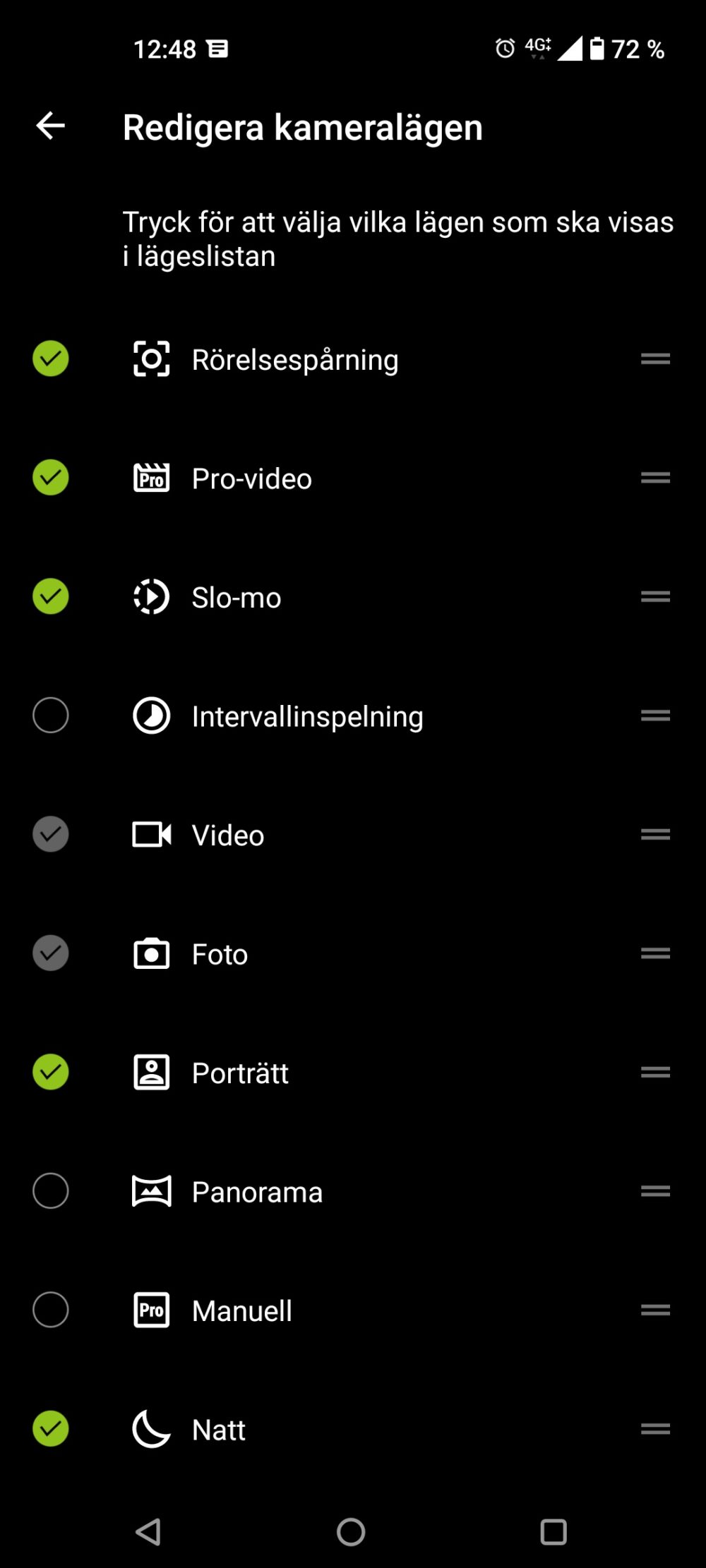 En detalj som visat sig vara riktigt användbar är funktionen att själv kunna välja vilka alternativ som ska finnas nära till hands i nederkanten av kameraläget. Exempelvis är kanske Dokument nedprioriterad gentemot Natt eller Porträtt. Dokument kan då lätt avmarkeras och tar sedan inte upp plats bland snabbalternativen. Ett utmärkt sätt att snabbt hitta rätt funktion.