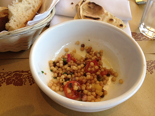 Käket då? Jo tack, här finns en hel del trevligt att välja på, med priser som drar åt det lite högre hållet. Huvudkyparen talar och kan italienska specialiteter (alltid ett plus, tycker vi!) och restaurangen bjuder på färskt bröd, egen-importerad olivolja (såklart! läs också baksidan så får du familjens historia) samt en slags bulgur-sallad med tomat och vinaigrette. Väldigt smakligt att sätta igång magsafterna för huvudrätten.
