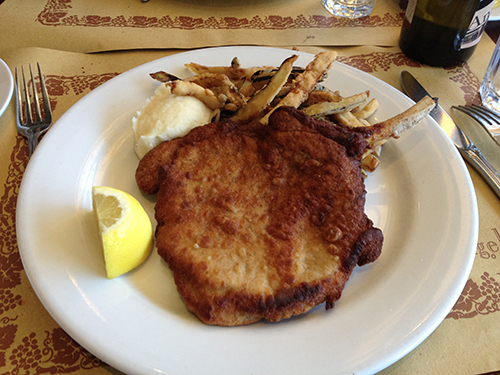 Desto mer imponerade blev vi av Pork Chop á la Milanese, som i princip är en bit bra fläskkött (med del av benet kvar) brödad och utbankad till schnitzel, stekt till perfektion, som serveras med citron samt stekt zucchini och krämig squash-mos (173 kr). Schnitzel är svårt att få till riktigt bra på restaurang, då det kräver bra råvara och lite is i magen – man vill ju inte ha fläskkött som är för rått, men inte heller torrt. Angelini Osterias kök gjorde det perfekt och det var en portion som hette duga. Även tillbehören smakade bra, men var väldigt mättande.