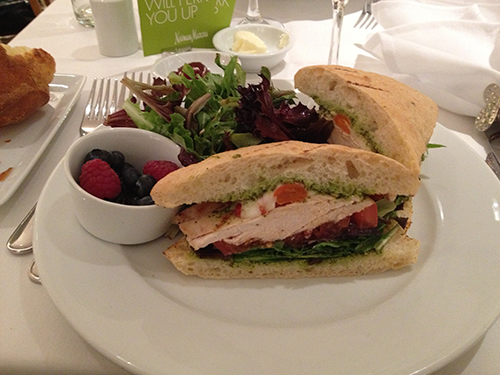 Vi tog in en Chicken Sandwich Special (149 kr), en kall, men påkostad macka med kycklingfilé, mozzarella, pesto och tomat samt en liten grönsallad och en liten fruktskål (med pinfärska blåbär, björnbär och hallon). Fräscht, gott och mättande.