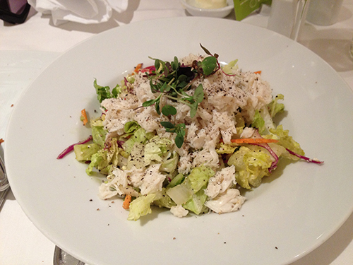 Crab Sallad (198 kr) hade – som förväntat – generöst med krabbkött (som dessutom kändes bra kvalitet, inget fusk-på-burk) och en bra bladning grönt och vinaigrette. Helt OK, men något för högt i pris för totalupplevelsen.