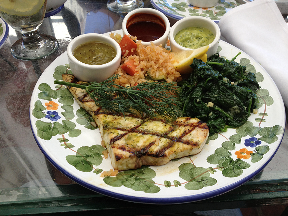 Betydligt mer prisvärt var då istället Swordfish Special (Svärdfisk-special, 305 kr), en utsökt filé svärdfisk med kokt spenat, spanskt ris och tre kryddade såser. Snyggt upplagt på trallriken, välgrillad fiskbit som hade bra stekyta, men ändå var saftig inuti och kombinationen såser och tillbehör var visuellt och smakmässigt genomtänkt.
