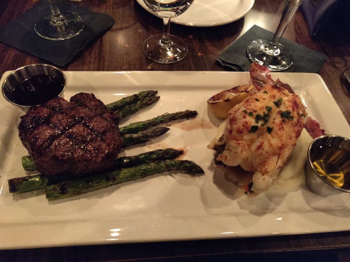 Vi gav oss på signatur-rätten, som blandar två av restaurangens specialiteter – nötkött och hummer, också känt som Surf ’n Turf. Här bjuds du på en generöst tilltagen oxfilébit (vi frågade inte om vikt, men klart närmare 250 g), grillad till absolut perfektion (dvs medium rare) och en ordentligt fullvuxen, halv Maine-hummer (pris 480 kr). Gillar du inte kött kan du istället få en hel hummersvans (istället för en halv sådan).
