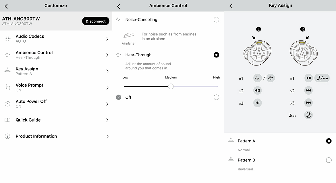 Det sitter en knapp på vardera hörlur och i default-läget styr du brusreduceringens (ANC) känslighet, av och på med knappen på vänster hörlur och du styr paus och hoppa-låt samt assistenten med höger hörlur. Även om det är en smidig lösning så använde jag ändå hellre appen. Knapparna sitter vettigt placerade och är lätta att hitta.