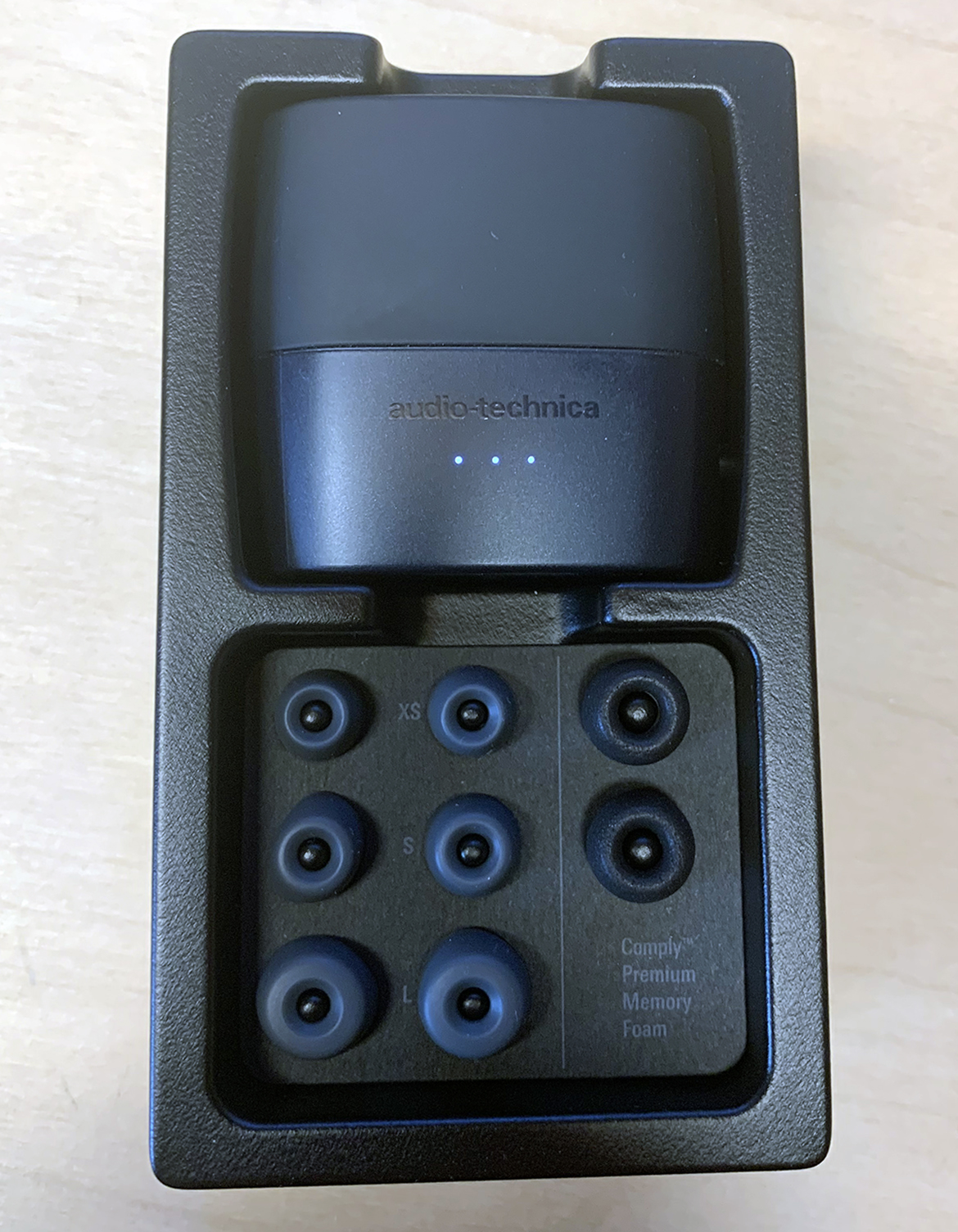När jag öppnar kartongen till ATH-ANC300TW från japanska Audio-Technica så inser jag två saker. Ett: ladd-asken är mycket större än de till de andra lurarna vi testat; den är till och med i största laget – anser jag – med sina 5,5 x 5,5 cm x 3cm. Två: Fabrikören sparar verkligen inte på krutet att skicka med olika gummiproppar för att du ska kunna hitta den perfekta passformen. Det finns till och med två stycken i memory foam för extra passform.