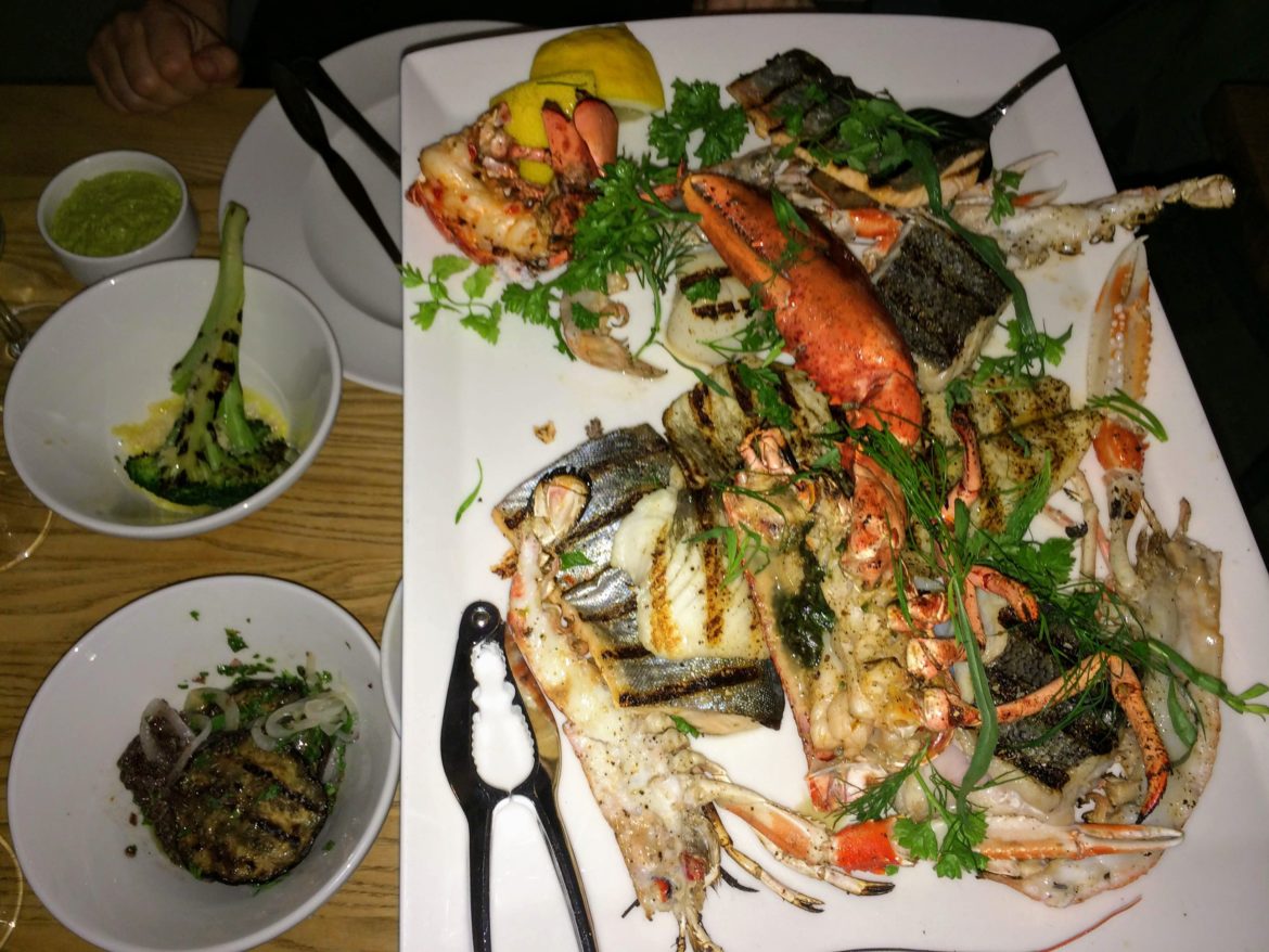 Varmrättsvalet föll också på en för oss rekommenderad rätt, nämligen Fisk och Skaldjurs Mixed Grill, som serveras för två (590 kr totalt). Här bjuds det på en uppsjö av grillade delikatesser: tre olika fiskar (som kocken väljer efter dagsform), två havskräftor, två pilgrimsmusslor och en halv hummer. Till detta tog vi de rekommenderade två tillbehören var: pommes frites, grillad broccoli, grillad aubergine, grillad paprika med feta-ost. Av dessa var pommes friten överlägset bäst, följt av den helt OK broccolin och den lite tråkiga auberginen, som var något smakös och ackompanjerad av lök och tapenad. Paprikan hade fin grillyta, men kändes underlagad för vår smak och feta-tärningarna hade bara lagts på, istället för att till exempel smältas inuti paprikan, vilket hade varit gott. Såserna fick bli Ört- och Kryddsmör samt Hummer-vinaigrette, vilket också gav all smak till fisken och skaldjuren. Dessa var nämligen helt osaltade och utan krydda – vilket delade sällskapets åsikter: en tyckte det var perfekt att var och en får krydda efter smak med vald sås, en annan att det smakade väldigt lite. Och sannerligen är det ju så att perfekt grillad, fin fisk smakar väldigt lite – vi hade röding, kungsflundra och kummel, alla med superfin grillyta som gav smak och samtidigt perfekt saftiga, utan att var råa eller överkokta. Som helhet så mättade huvudrätten med tillbehör också hela sällskapet väldigt väl.