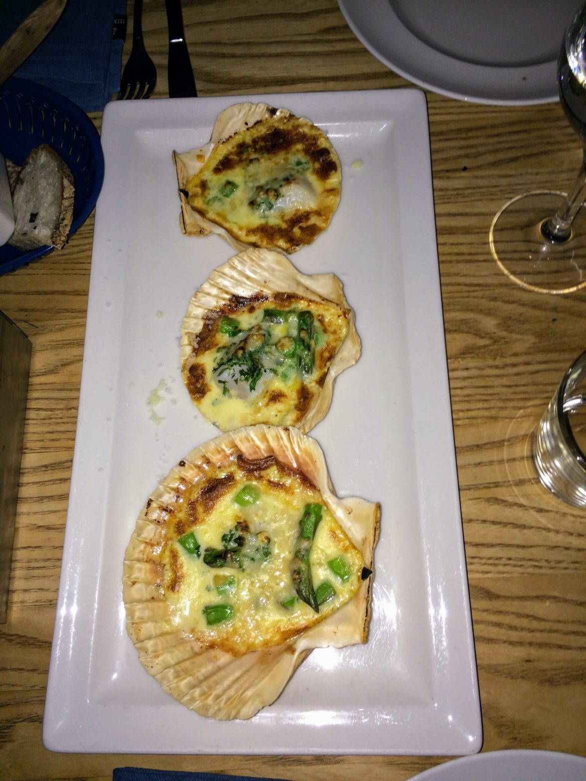Eftersom vi gillar vitt vin och pilgrimsmusslor så rekommenderades vi förrätten Gratinerade Pilgrimsmusslor (165 kr), en vackert presenterad historia med en pilgrimsmussla serverad i snygga snäckskal. Gratineringen bestod av sparris, dragon och vitvinssås och rundade av rätten perfekt. Detta ihop med de ypperligt tillagade pilgrimsmusslorna, som var exakt medium rare så att de varken kändes råa eller för sega och torra.