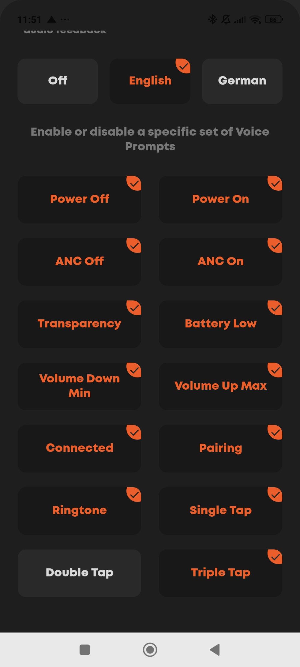 Vidare kan du exempelvis i detalj välja vilka röstmeddelanden som ska vara aktiva. Vill du exempelvis inte höra upprepade varningar om att batterinivån är låg kan avaktivera dessa eller helt enkelt stänga av samtliga notifieringar. Och givetvis kan du välja in tyska, förutom engelska, som standardspråk. Brusreduceringen har adaptiv eller manuell inställning och lika som med genomhörningen finns fem nivåer att välja mellan. Och slutligen den inbyggda EQ med ett antal förinställda alternativ och fem frekvenser du själv kan ställa in. Ganska standard det med.