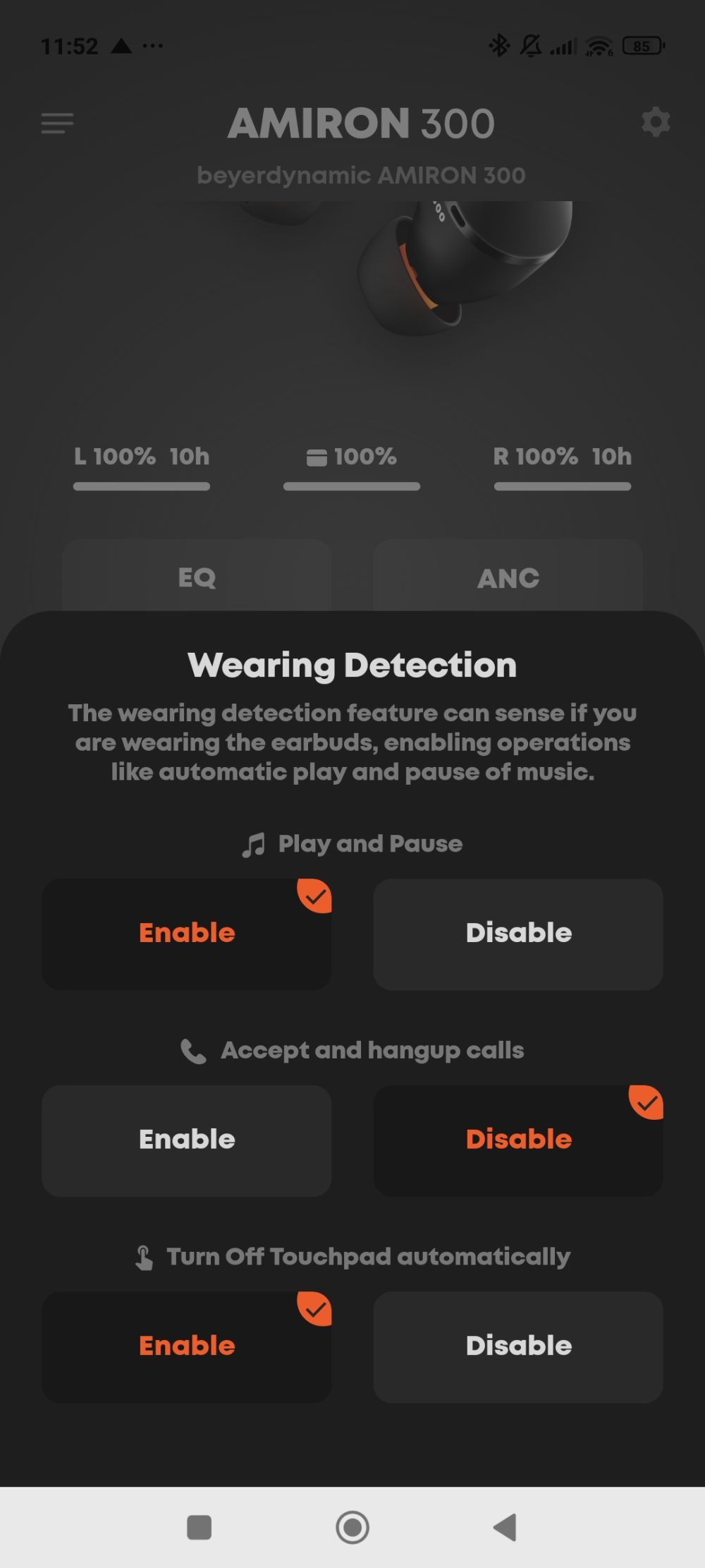 Direkt märker vi förbättringar när det gäller kontroll och alternativ i appen. Framför allt har nu Beyerdynamic på riktigt kommit in i matchen vad gäller kontroll med knapparna. Du får 1-klick, 2-klick, 3-klick, långtryck 2 sekunder och kort-långtryck. Det är dessutom väldigt enkelt att ställa in respektive hörlur tack vare ett genomtänkt gränssnitt och det enda som är bundet är långtrycket med vilket du justerar volymen. I övrigt är det fritt fram vilket ger en tydlig tumme upp! Beyerdynamic har också inkluderat begreppet Sidetone där du kan välja om du vill höra din egen röst eller inte när du använder hörlurarna som headset.