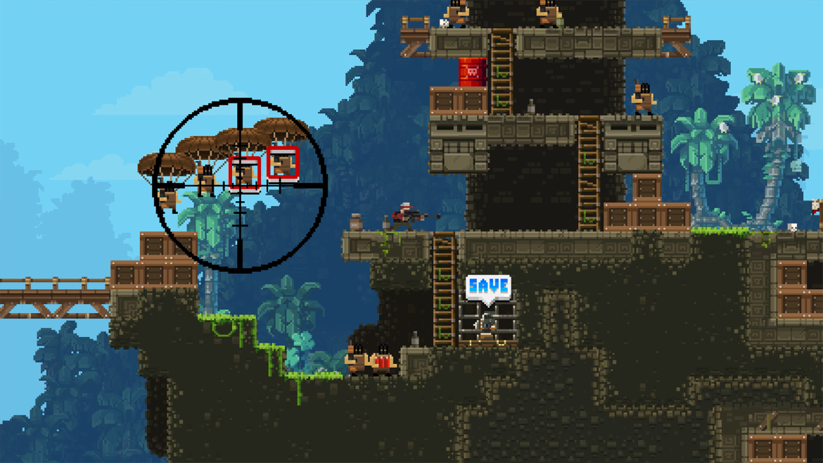 Grafiken är härligt retro pixlig och våldet är så överdrivet som det bara kan vara. För varje Bro du räddar så får du fler liv och låser därmed även upp nya Bro´s att spela.