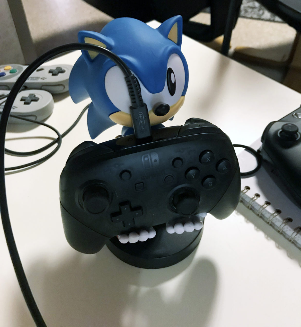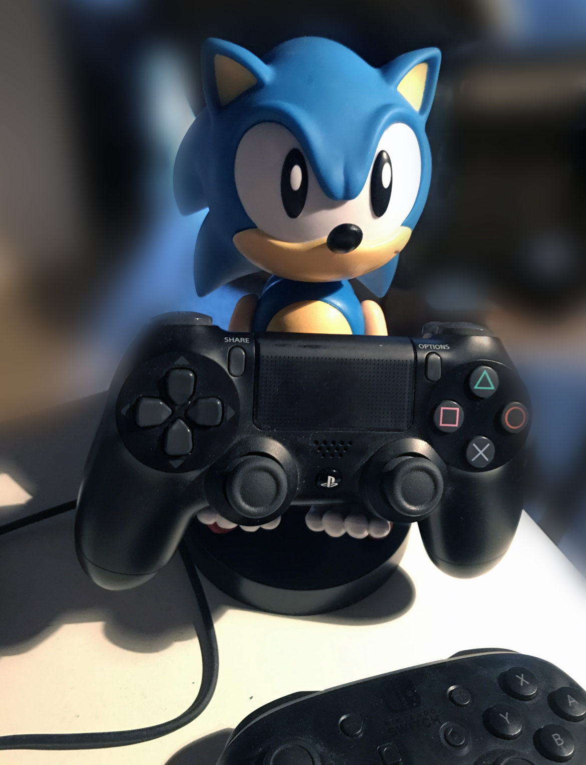 Men så är alltså inte fallet. Detta är endast en plast-staty där du kan lägga din handkontroll i händerna på Sonic, medan den laddar via kabel från annan strömkälla. Laddkabeln som följer med är endast en bonus ifall du inte skulle ha en sådan (mikro-USB) till din handkontroll.