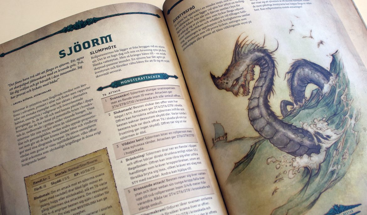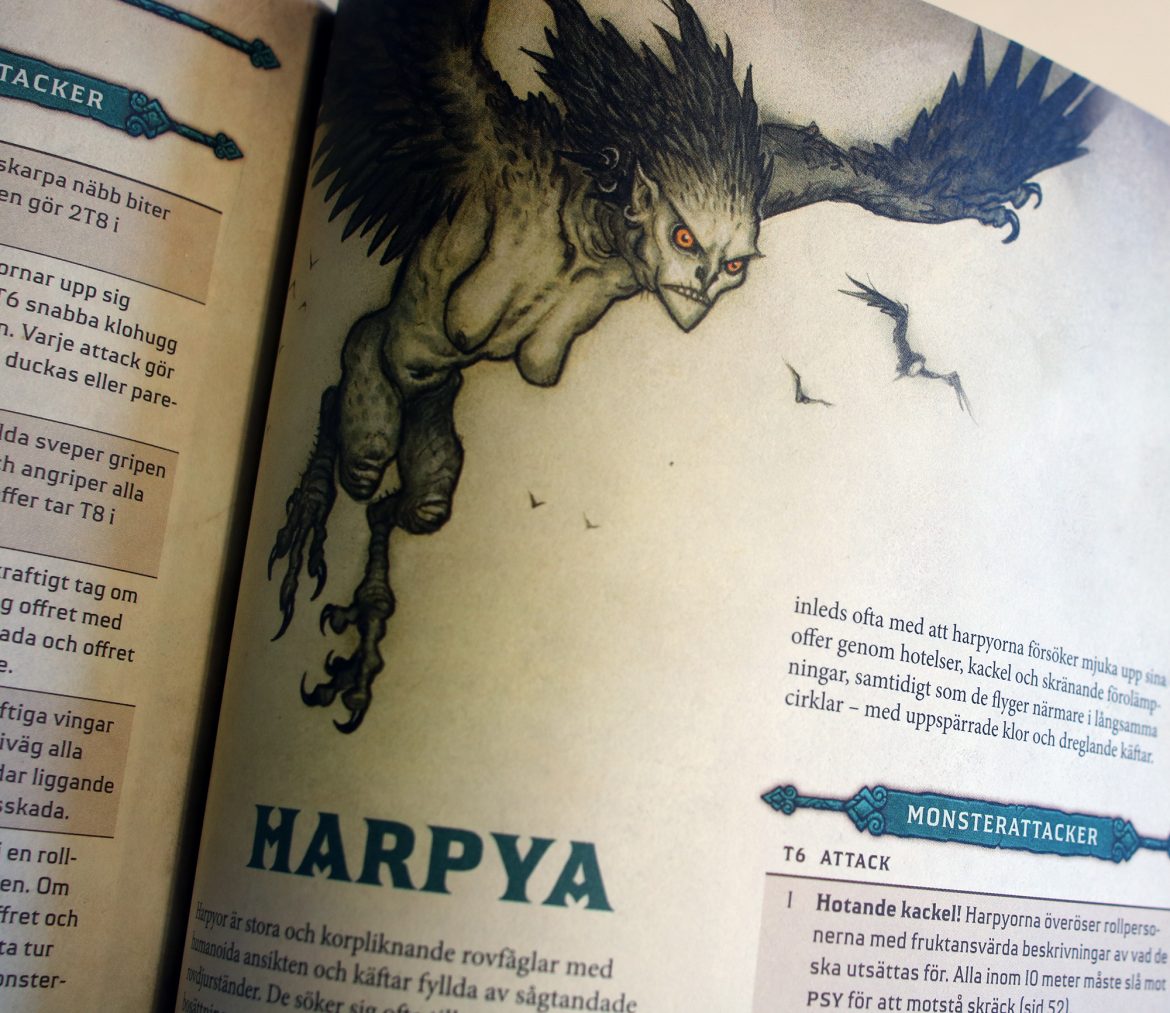 Drakar och Demoner: Monsterboken är en vackert inbunden bok på 148 sidor och varje uppslag har en ny varelse eller folkslag. Här finns en detaljerad beskrivning om dess bakgrund och färdigheter, samt en överskådlig genomgång av hur du skapar den plus en vackert illustrerad bild. Det jag gillade mest var att på varje varelse finns det en kort beskrivning om ett slumpmässigt möte med varelsen och även en kort text med rubriken “äventyrsfrö”. Med stöd av dessa två texter kan du med lätthet skapa ett ganska spännande äventyr utan att behöva hitta på precis allt själv.