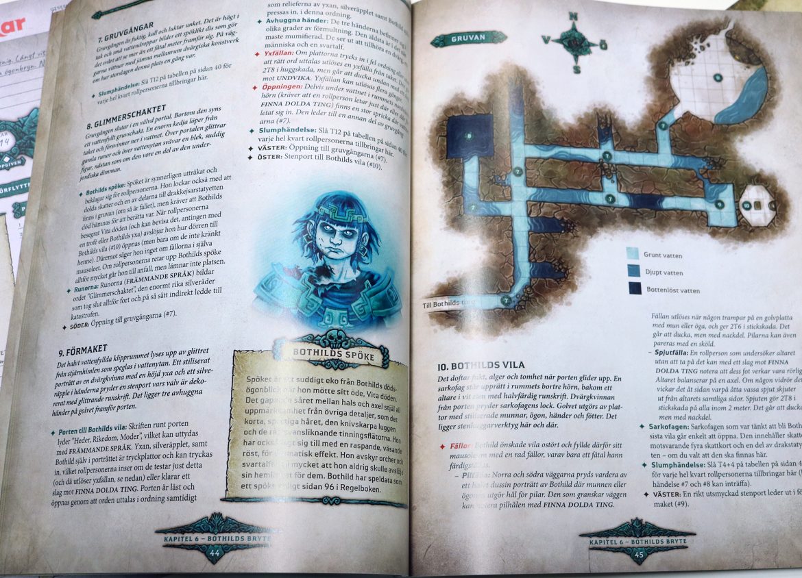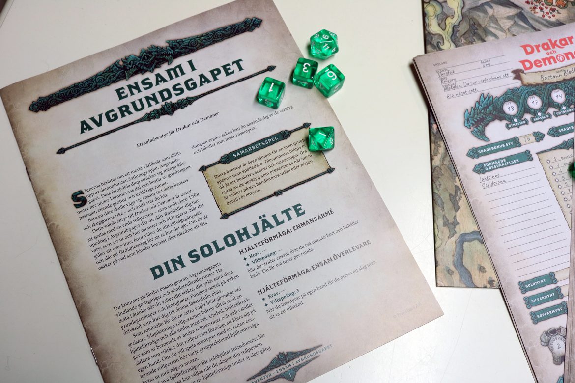 När jag sedan med spänd förväntan fick hem den nya lådan så var det lite av en andaktstund att få riva av plasten och sätta tänderna i denna nya och uppdaterade version. Drakar och Demoner start-kittet innehåller tärningar (ett enormt plus!), karaktärsblad (både redan ifyllda med färdiga karaktärer och fem blanka), kartor, stridskartor och figurer som du kan ställa ut för att lättare visualisera strider. Det finns även en regelbok (112 sidor), en äventyrsbok (116 sidor), Skatter-kort och äventyrs-kort. Men det som verkligen var pricken över i-et för mig är häftet som går igenom hur du kan spela Drakar och Demoner helt ensam. Detta är perfekt för den som vill uppleva äventyren, men inte har möjlighet att spela med andra eller för en spelledare som vill bekanta sig med reglerna ordentligt innan man startar en kampanj.