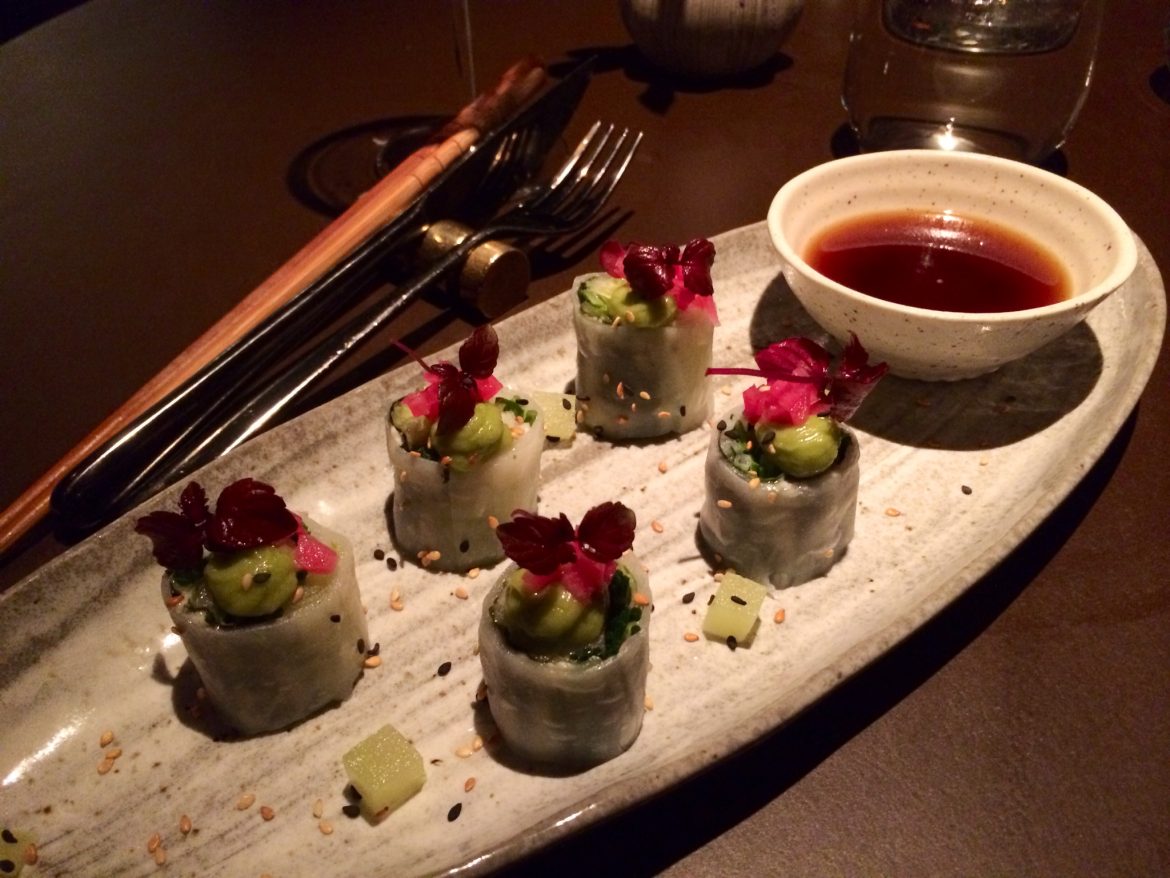 For the main course, we selected the tuna with Thai salad, papaya, and coriander, along with a vegetarian dish of garden rolls comprised of ingredients such as ginger, cos lettuce, and chili mayonnaise. The presentation was meticulous, with small, artfully arranged portions. The flavors were fresh and satisfying.