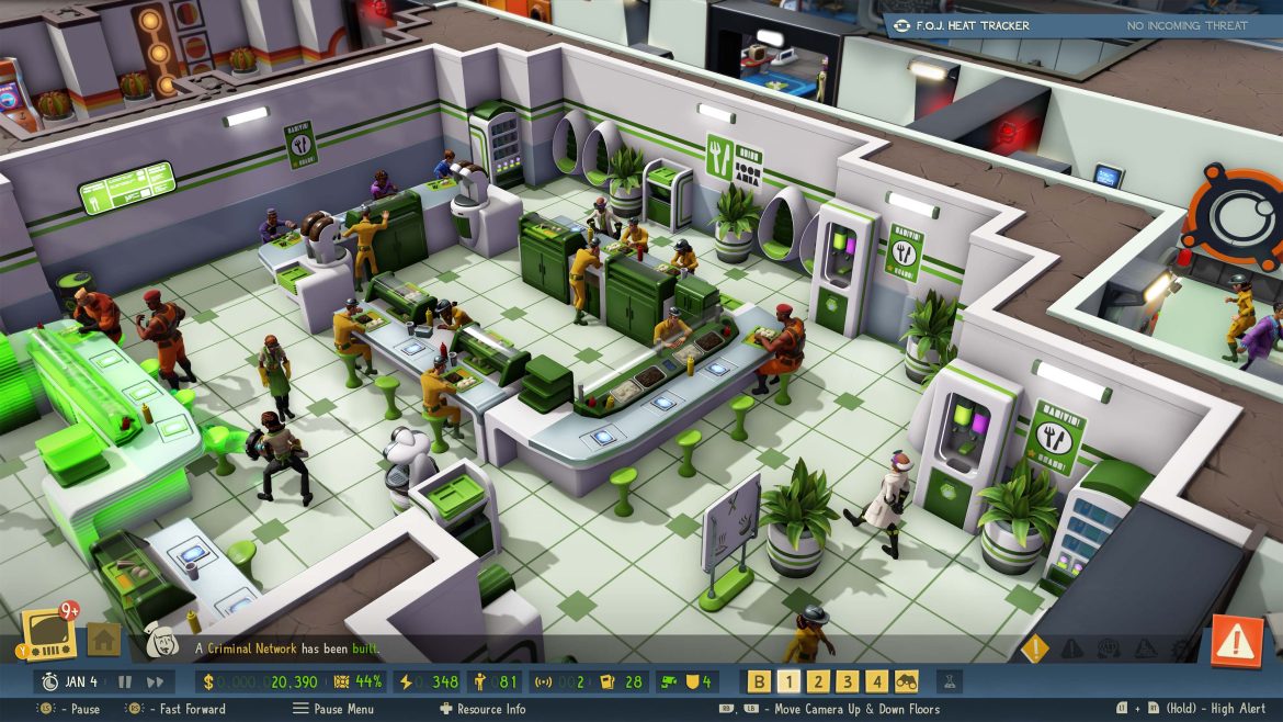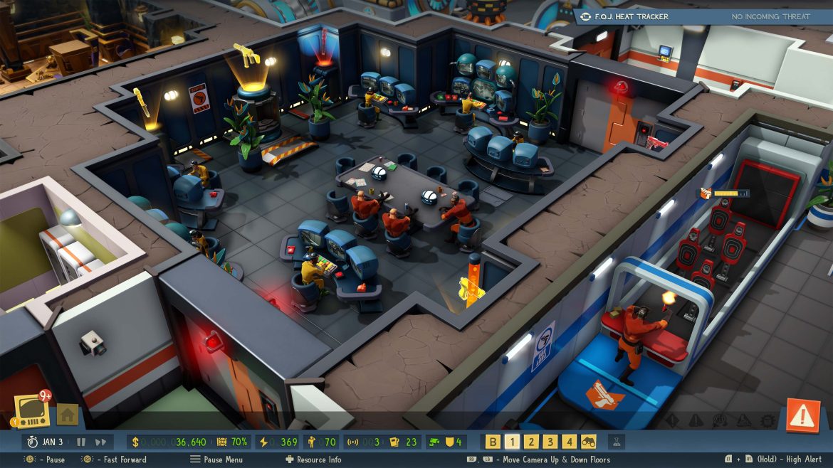 Först ut till det jag verkligen gillar med Evil Genius 2: World Domination och det är grafiken, humorn och alla sköna, filmiska blinkningar. Du kan välja mellan fyra olika elakingar att spela som och den jag valde, Max, är helt klart inspirerad av James Bond-skurken Blofeld. Även musiken är väldigt Bond-inspirerad. Grafiken är både snygg och ren och du kan zooma ner till marknivå och röra dig bland dina hejdukar på riktigt nära håll. När du zoomar ut maximalt så har du en bra överblick över hela din bas.
