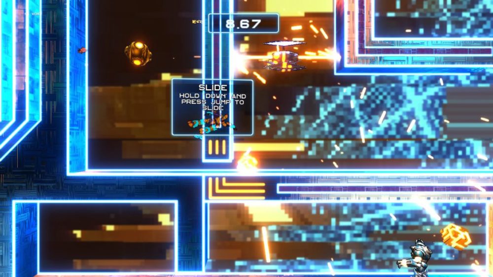 Exception fungerar alldeles ypperligt på Nintendo Switch. Även om spelkaraktären som du styr är ganska liten i bild så är spelet ändå lika roligt och överskådligt i bärbart läge. Efter några banor så möter du en boss och så får du mer information om hur det går i din jakt på viruset. Mellansekvenserna har fin grafik, men är ganska enkelt animerade med stillbilder. Ändå välgjorda och roliga och det är en hel drös med banor att spela igenom.