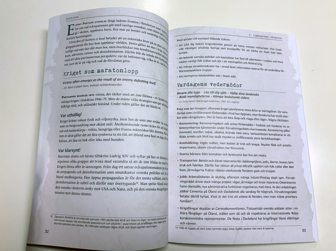 Sammanfattningsvis är Expert Partisan ett spännande rollspel och att det utspelar sig i Sverige gör att man verkligen kan detaljnörda ned sig i 80-talets Svedala. För dig som är lite historieintresserad kan du även skapa ett alternativt händelseförlopp om alla gånger vi faktiskt var nära krig under den här perioden i Sverige. Det enda som är synd är att tärningar och rollspelsark inte ingår, men det är en ganska billig penning att köpa till, och arken går att ladda ner.