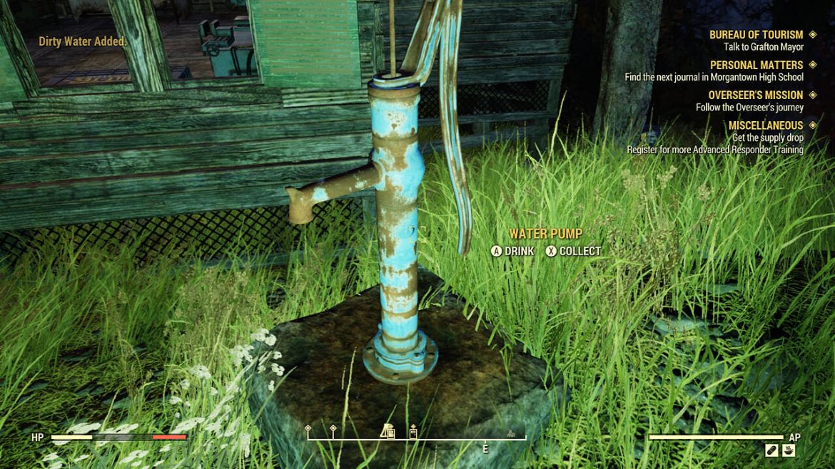 För det är tyvärr det som är problemet med Fallout 76: det är riktigt korkat. I de andra spelen från del ett till och med del fyra så har alltid historierna varit engagerande, både huvudstoryn och sidohistorierna. Du har alltid varit investerad i de karaktärer du möter och du vill hjälpa en del och döda andra. Du njuter av att vara hjälten eller – om du är lagd åt det andra hållet – så njuter du av att brisera en atombomb i något litet samhälle utanför New Vegas. Oavsett så är det den rika blandningen av uppdrag och äventyr som gjorde spelen värda att spela och kämpa vidare i för att bli bättre, skaffa bättre utrustning och förmågor. I Fallout 76 finns ingenting av ovanstående. Alla uppdrag får du via datorer och robotar och de du hjälper är sen länge sedan döda. Det är samma trista skräp-uppdrag som du kan få i World of Warcraft och liknande spel. Så kallade Fetch Quests: ”Gå dit, hämta det där, och kom tillbaka hit så får du en guldpeng”. Hur kunde det gå så illa? Hur kunde ett spel som hade så många underbara uppdrag bli så här kallt och tråkigt? Sen har vi hela den här samla-på-all-skit-du-hittar-så-du-kan-bygga-vapen-och-hus-grejen. Problemet är att du kan inte packa på dig hur mycket som helst och din förvaringslåda och ditt hus kan bara innehålla 400 saker. Du kan inte springa eller snabb-resa när du är överpackad med saker, så du får snällt promenera tillbaka till ditt läger. Du måste äta och dricka som en sockersjuk person på tivoli, jag tror jag stod i tio minuter och bara pumpade vatten för att kunna ge mig ut; vatten som väger så att du inte kan bära på andra grejer. Suck! Problem, problem, problem, pro…