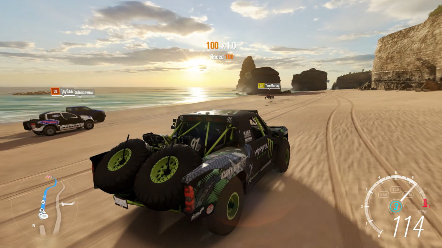 Du som spelat tidigare Forza Horizon-spel (ettan finns just nu att ladda hem gratis om du har Xbox Guld) kommer att känna dig helt hemma i Forza Horizon 3. Man kör från event till event, denna gång bygger man ”fans” i tiotusental istället för att få armband i olika färger när man levlar upp och du kan fortfarande delta i både tävlingar, versus-lägen (rivals) såväl som specialevent (dessa är väldigt roliga – men för få) där du ofta race:ar mot helt oväntade motståndare. Horizon 3 har även stunts som du kan utföra för att vinna fans och förutom de klassiska fartkamerorna finns även andra specialsträckor där du bland annat ska e-bromsa (handbromsa) dig igenom en så stor del av sträckan du kan. Att du styr över festivalen betyder i praktiken inte jättemycket mer än att du kan signa förare och radiokanaler, som kan ge dig bonusar, samt bestämma utformningen på tävlingar (antal motståndare, klass på bilar etc). Det är småkul, men ingen större revolution och du kan lätt bara strunta i det och glida med på spelets förinställda tävlingar och utmaningar. Här finns också ett ”illegalt” street-racing-läge som körs på natten och uppmanar till buskörning i bebodda kvarter samt ett co-op-läge, som var lite svårt att testa i vår förhandsversion, men verkar funka fint om du har en bra uppkoppling och en vän att spela med (allt du gör i co-op-läget tar dig dessutom fram i storyn, så det är väl värt att prova).