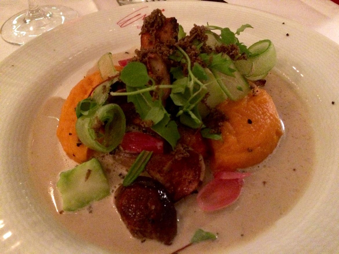 Svenskt höstlamm – Eriks Gondolen. Foto: senses.seDenna lamm-trilogi kändes perfekt balanserad. Här fanns en ypperlig lammfiol som var mör, smakfull och saftig, utan att ge eftersmak av får, som vissa restauranger slarvar med. Kombinationen med den söta och kaneldoftande pumpan samt att blanda in salt lammkorv kändes som fingertoppskänsla och det röda vinet som rekommenderades till – ett spanskt Emilio Moro (145 kr/glas) – kompletterade upplevelsen fullkomligt. Den enda fettklumpen – bokstavligen – var en strimma som kändes lite för tjock på bringan, som också blev lite hal och slemmig. Men som helhet en fantastisk rätt som trots sitt lilla omfång, mättade bra.