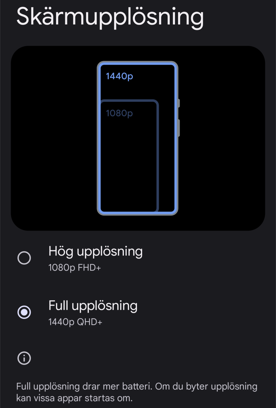 Det sitter en 6.7″ LTPO OLED som klarar upp till 120Hz och har en max upplösning på 3120×1440 (QHD+) även om standardinställningen är den lägre upplösningen FHD+ (motsvarar ca 1080p), så vill man utnyttja skärmen till max (mot att man ger upp lite batteritid) så behöver man ändra en inställning.