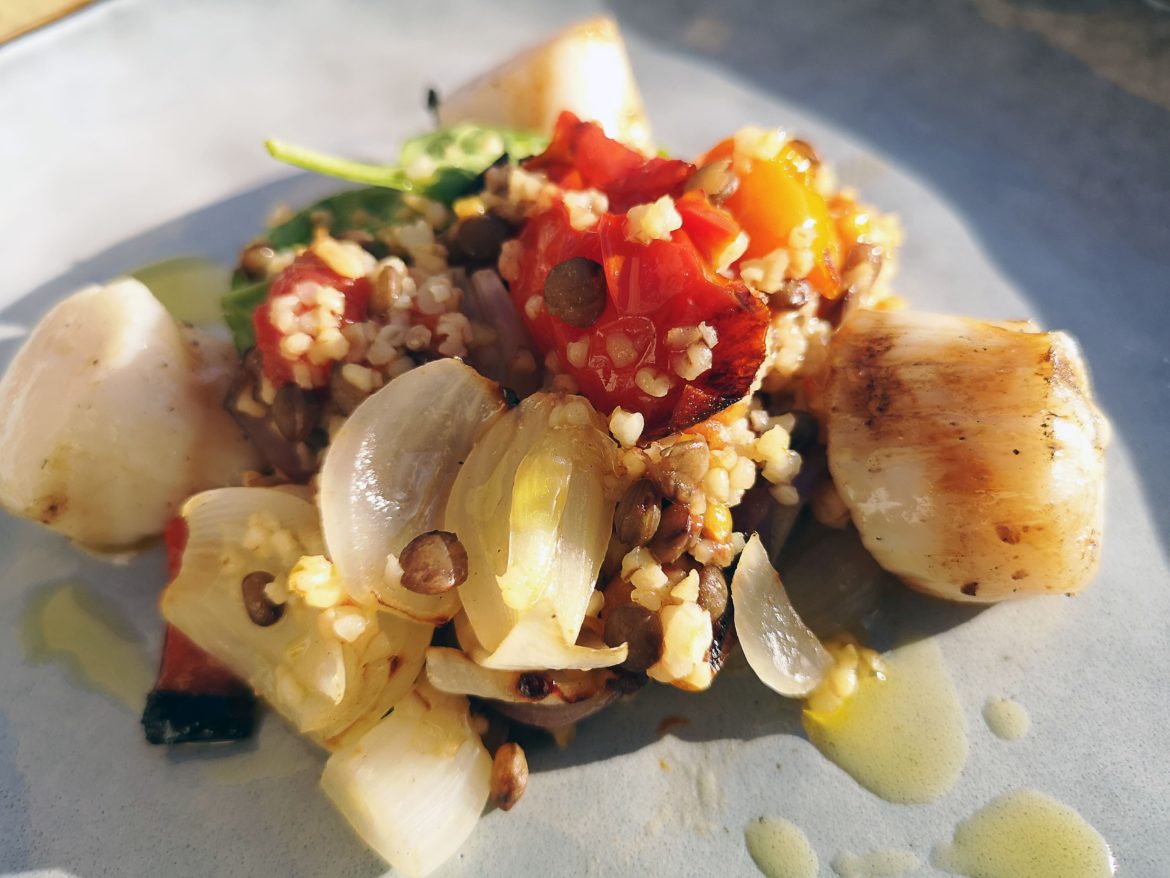 Grillade kammusslor med en ljummen bulgursallad och chiliolja får ni njuta av i den här veckans recept.