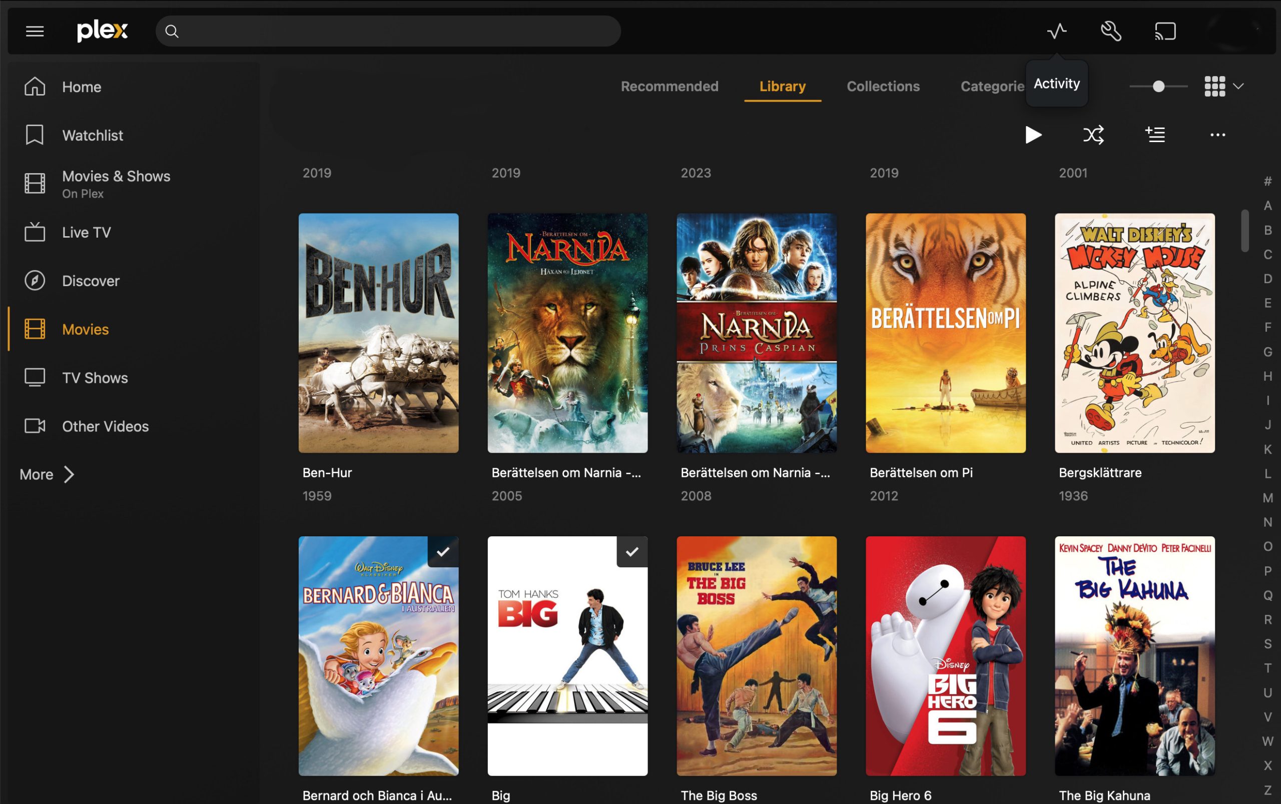 Installera sen Plex Media Server på datorn som du har hemma och som ska vara ”servern” för ditt filmbibliotek. Se till att den externa Plex-hårddisken du införskaffat är inkopplad i server-dator. När mediaservern är igång behöver du göra några inställningar och visa Plex vart dina filer ligger (på den externa hårddisken). Kör sedan ”update libraries”. Har du gjort allt rätt så ska Plex börjar bygga upp en snygg lista med filmomslag ur din alldeles egna samling. Om du inte gillar en affisch eller Plex identifierar filmen fel (eller inte alls) kan du göra justeringar eller ”fix match” via de tre knapparna.