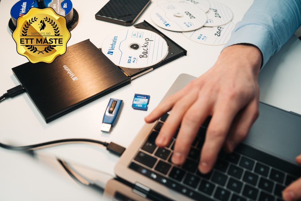 På datorn, vare sig du har en Mac eller PC (vi kör Mac på redaktionen så det blir formatet för denna guide också), så behöver du ha en optisk skivläsare. Dessa brukade byggas in förr men är ovanliga idag, så enklast är att du köper en extern USB-ansluten optisk läsare. Man kan tänka att för många behov kommer en kombinerad Blu-ray/DVD räcka långt. Där har vi exempelvis Asus BW-16D1X, som är en ganska rejäl pjäs med extern ström och en prislapp på runt 1 500 kronor. Ett smartare, mindre, mer mångsidigt och faktiskt billigare inköp är Verbatims UHD 4K-läsare 43888 som går loss på runt 1 300 idag och är vår referens-läsare här på senses. Den drar ström via USB-inkoppplingen till daton (både A och C stöds), är lövtunn och klarar både DVD, BD och UHD-filmer (UHD 4K-filmer kräver dock en uppdatering av firmwaren till något som heter LibreDrive, guide finns här). Betänk också att UHD-kopior tar uppemot 50 GB per film okomprimerade, så då rinner terabyten iväg fort. Dessa versioner av filmer kan bli flera gånger större än Blu-ray/DVD-versionerna på grund av högre kvalitet på bild och ljud.