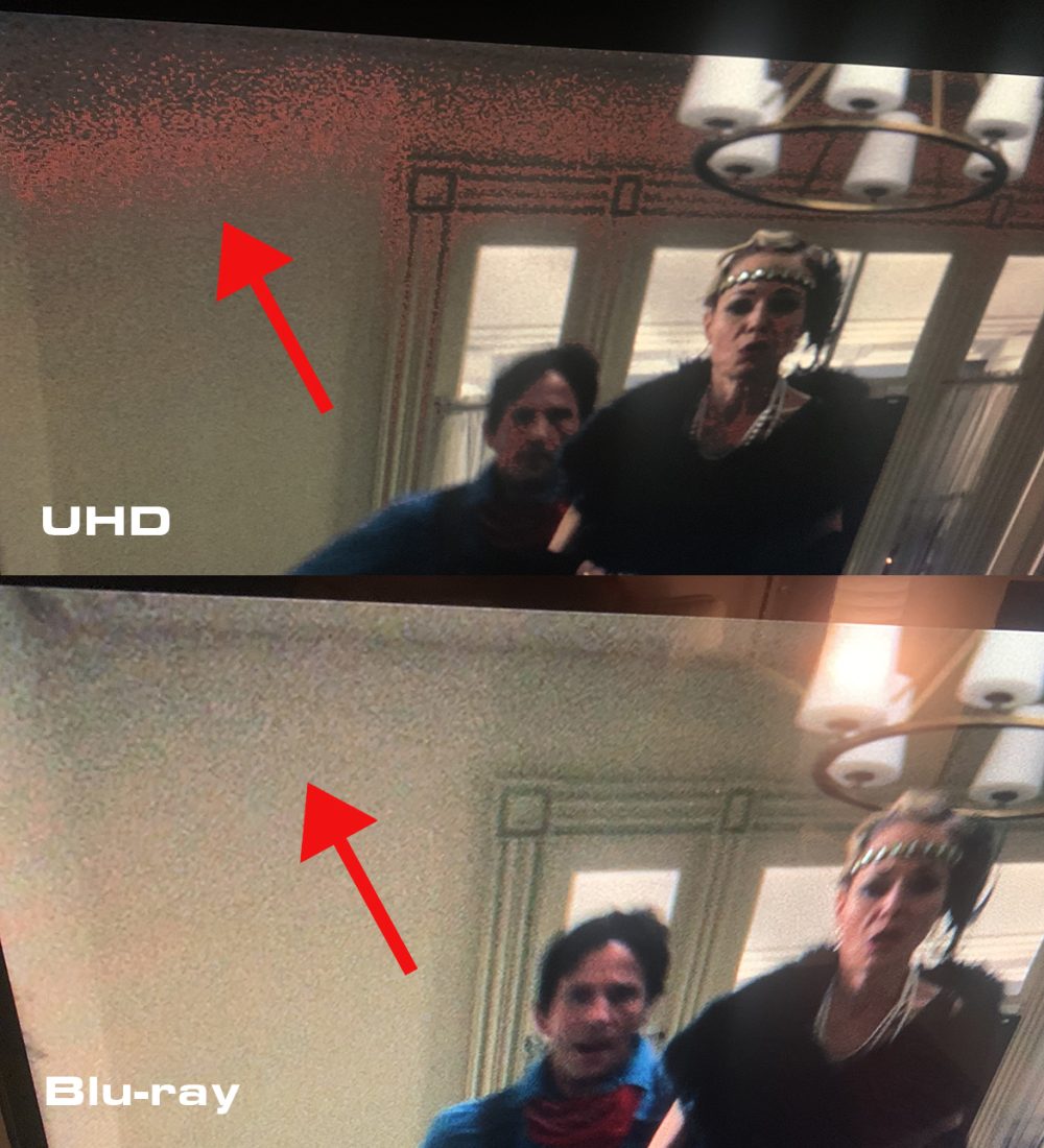 När jag startade filmen så upplevde jag något rött inslag i bilden som jag först tänkte var en effekt i filmen, men efter ett tag så blev det så pass påtagligt att jag irriterade mig på det. Så jag tog ur Ultra-HD skivan och satte i den medföljande Blu-ray skivan istället. Det röda ”bruset” finns inte med på Blu-ray skivan. Se bild nedan.
